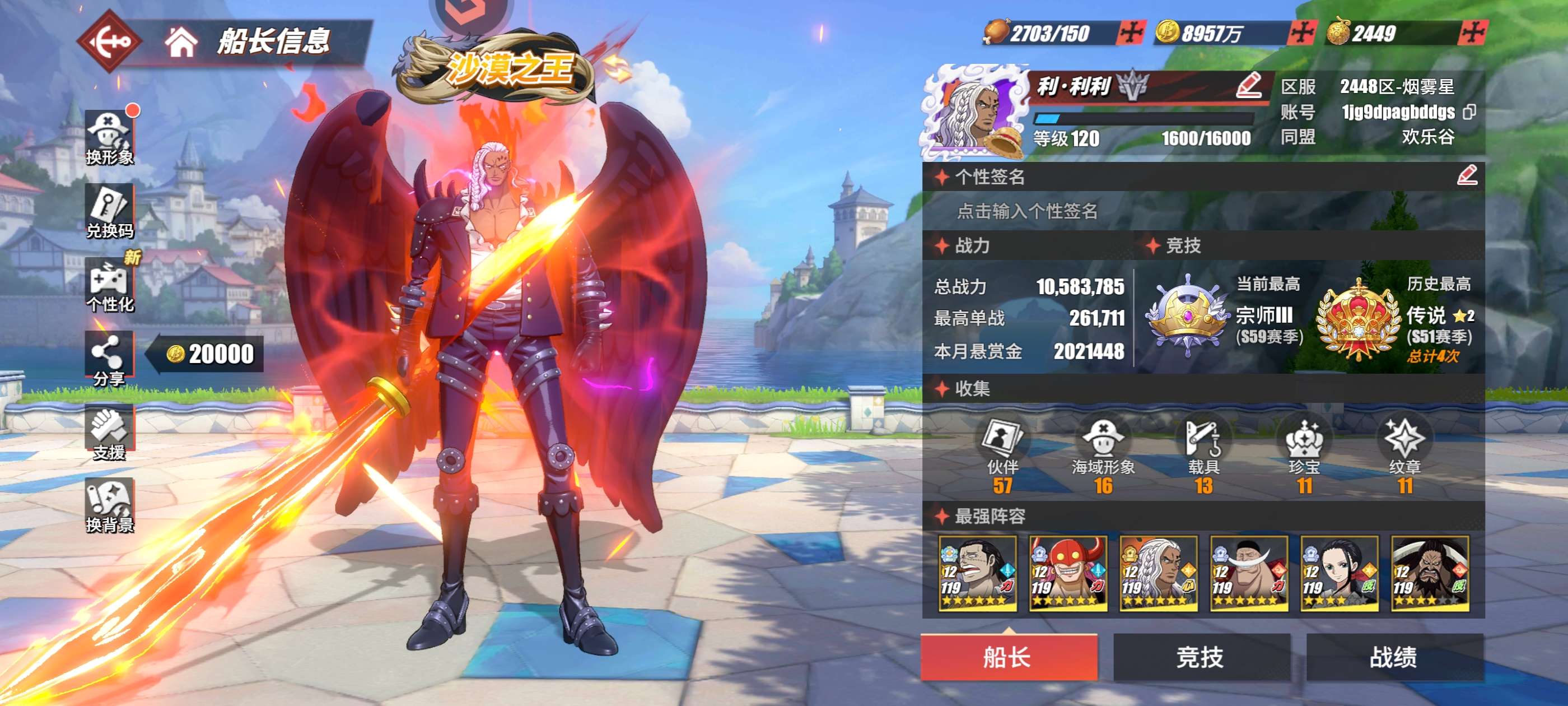 1.25亿战力。6星强者青白。6星强者魔神山治。4神船43艘船。3个98友情技。青年卡普76传奇1
