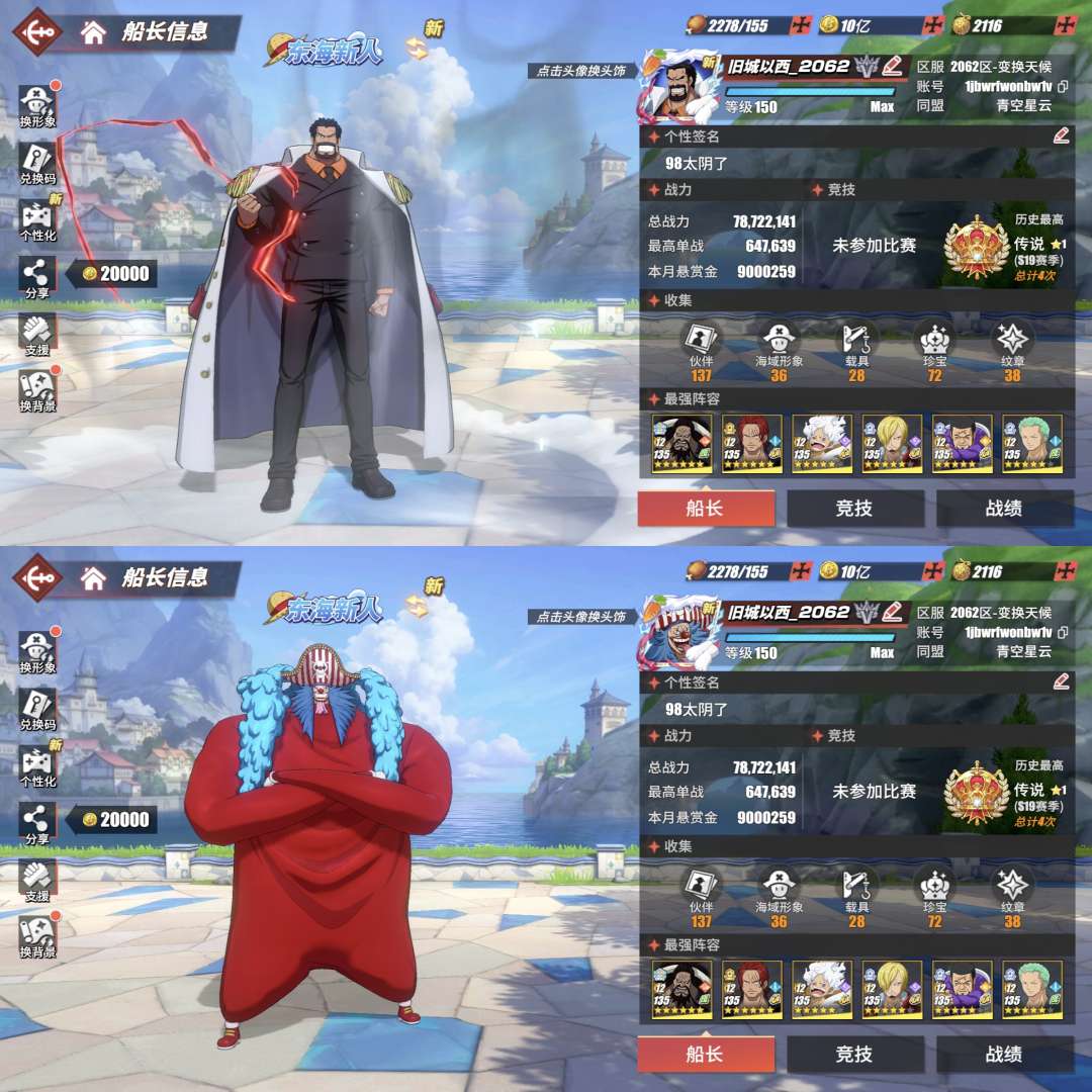 7872万战力。青年卡普。尼卡路飞84传奇14强者。1神船28艘船。珍宝:6凯多。尼卡。强者十字老