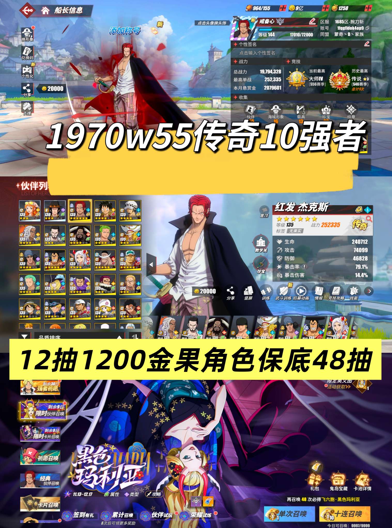 1970w55传奇10强者 鬼路,新世界鹰眼,和佐,青白,青年雷利,卡二等6星红发等1200金果12