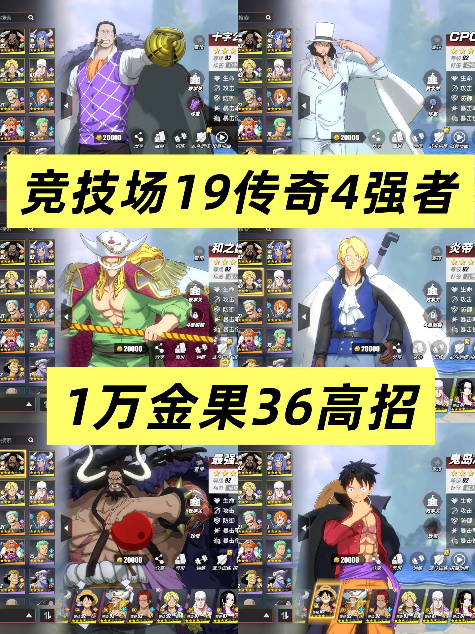 竞技场19传奇4强者 1万金果36高招 青白 炎帝萨博 十字公会老沙 cp0 鬼路 凯多 红发 1万