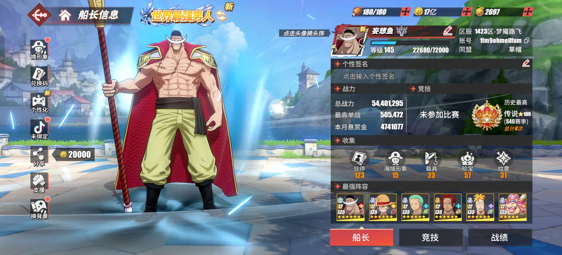 四神船1.2亿,6星和佐,红发大妈,裤赞新世界女帝等,6个98友情技,7个战斗皮肤,3.2w金果7抽