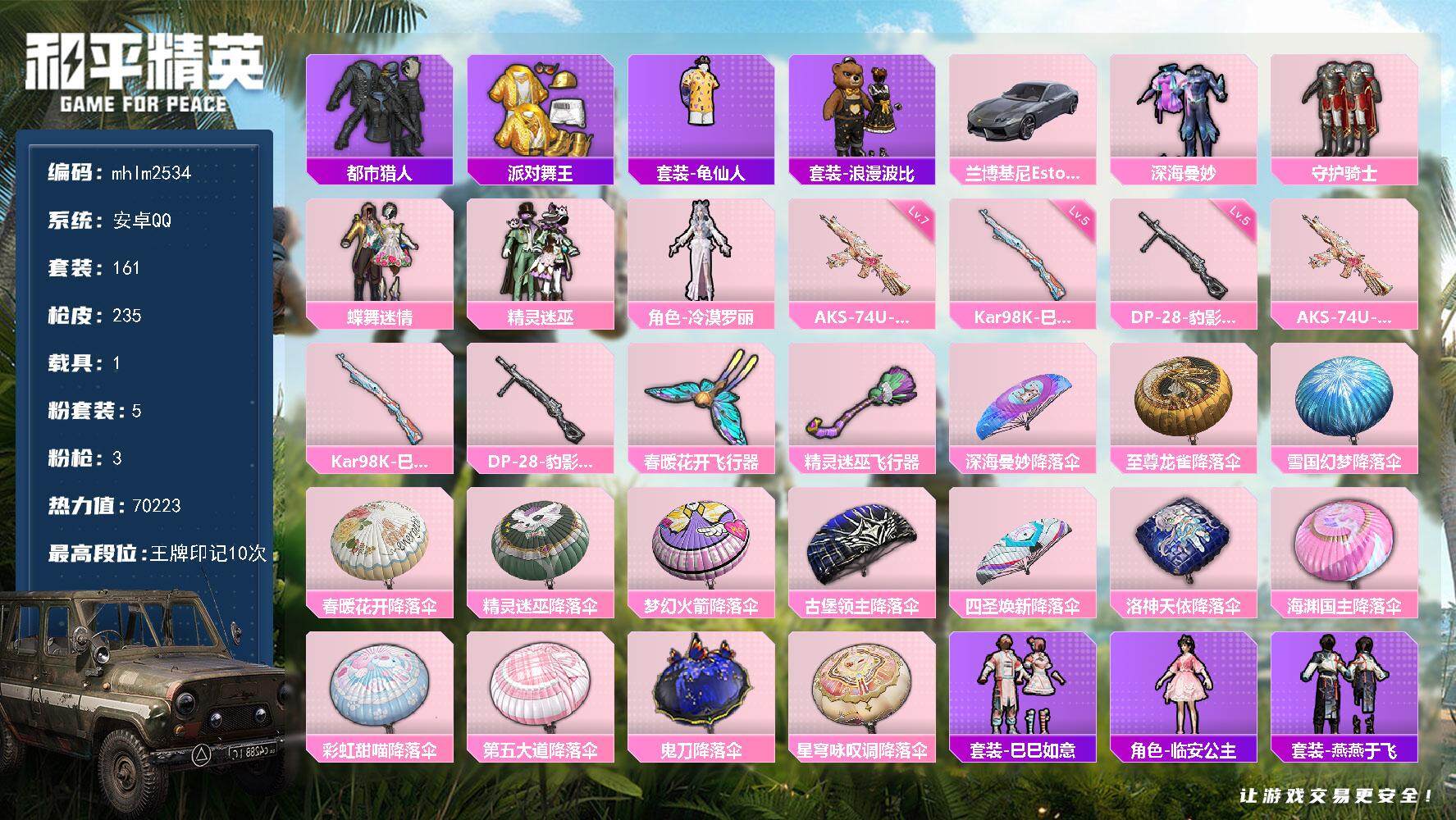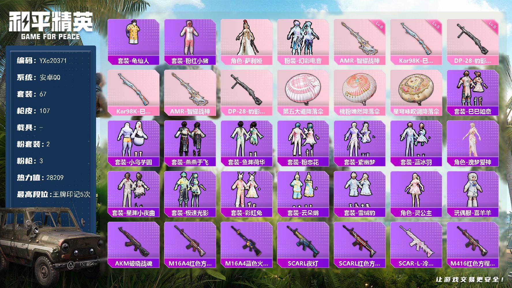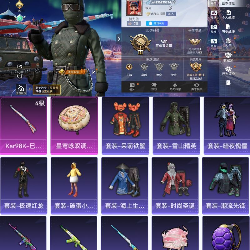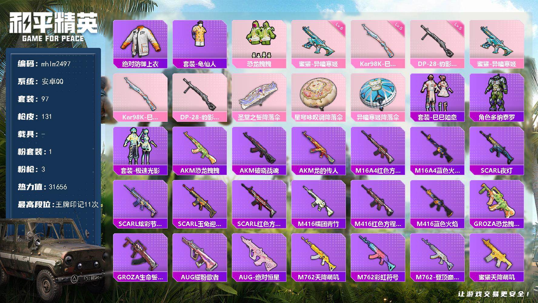 DD409(送暗区)【极品皇冠20年老号Q70级1特效枪】可二次 安Q吃鸡-74套装 64枪皮(可二次)18350热力值 4印记 历史超级王牌4星【1特效枪】Kar98K-巳巳如意(4级)【5热门】雪山精英 呆萌铁蟹 破蛋小黄鸡 极速红龙 暗夜傀儡 龟仙人 缤纷果语 炫蓝之夏 萌趣颜团子 SS12特训 海上生明月 时尚圣诞 M167A4-快乐主宰 M24-