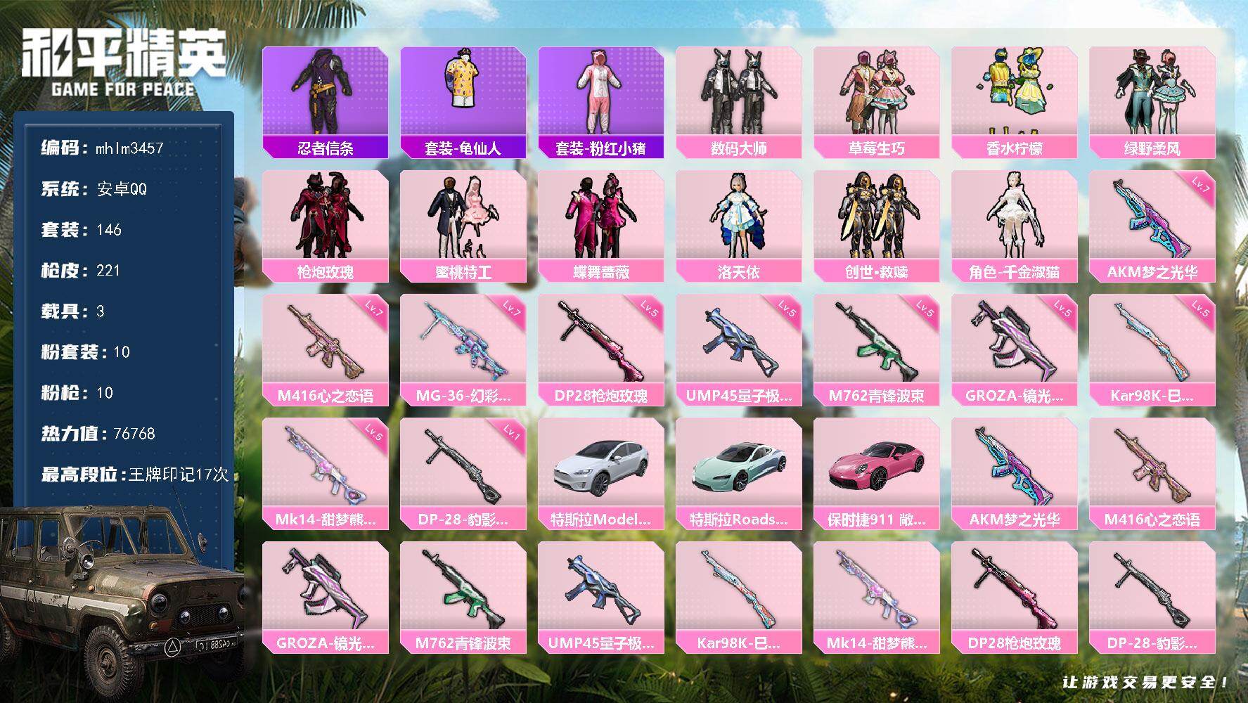 8粉装-3特效枪-1载具-3粉色飞行器-68592热力值-10王牌印记-176套装-200枪皮