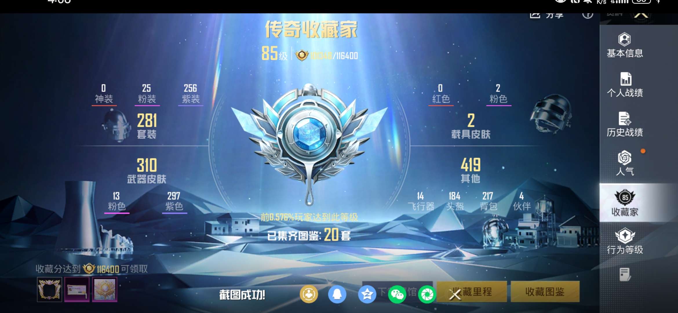 和平精英1红装4载具有个三币车,六个粉装7粉枪2个九级枪,王者贵族9,三典藏三个珍品无双传说