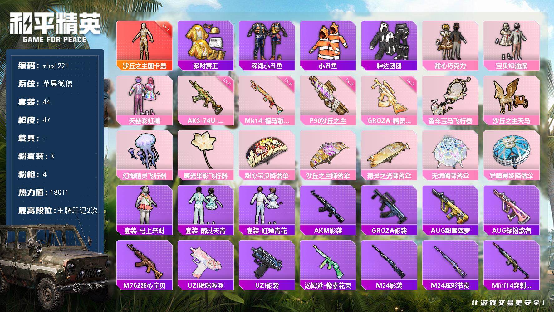 【mhp1221】苹果 微信-1神装-3粉装-4特效枪-0载具-4粉色飞行器-