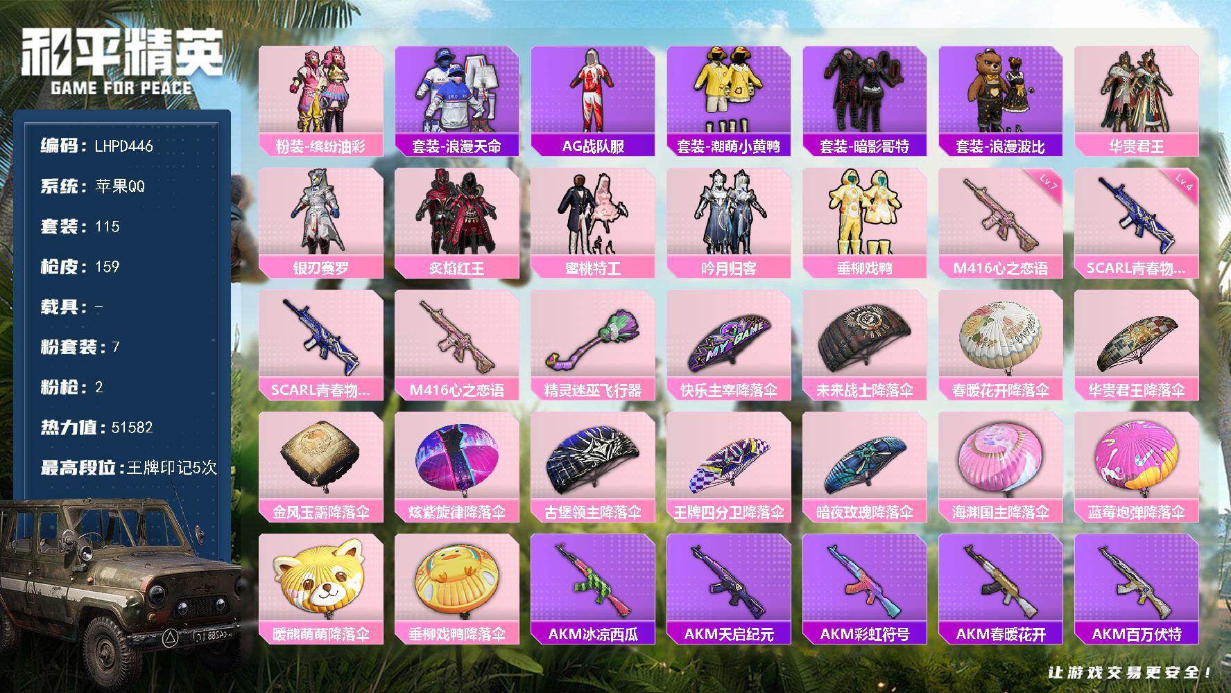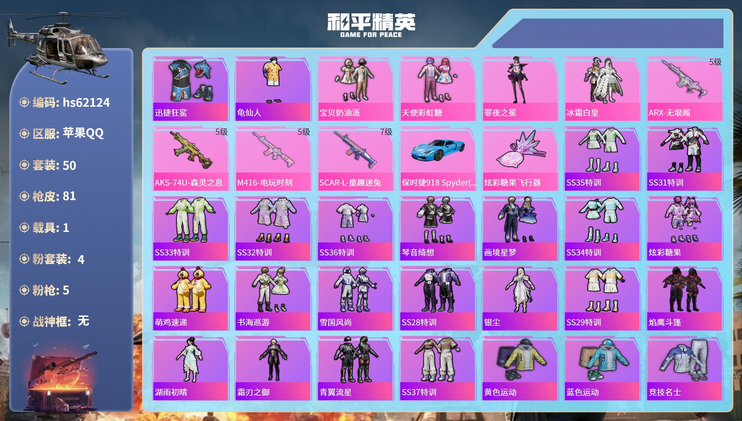 hs62124 苹果手Q-4王牌印记-4粉装-5特效枪-1载具-24846热力值-50套装-81枪皮