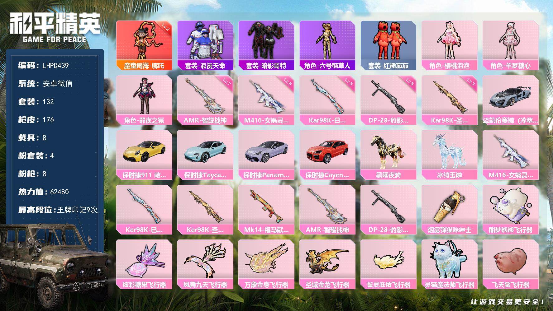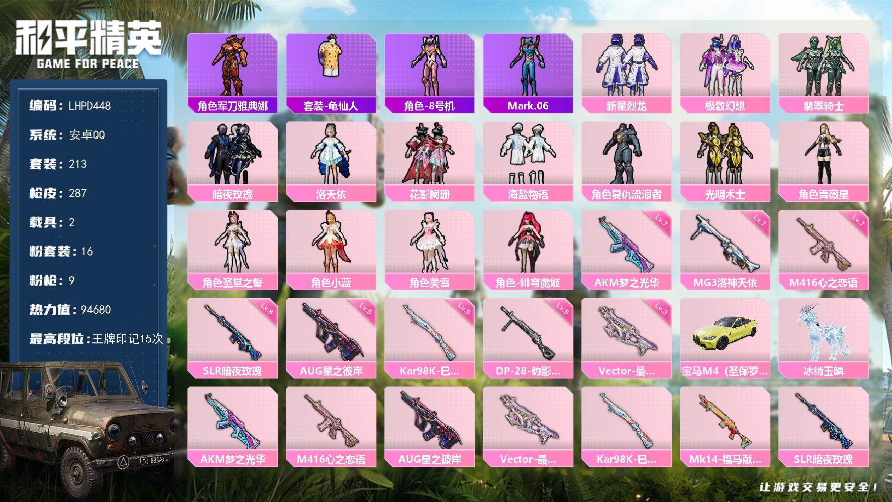 安卓 手Q-3神装-15粉装-10特效枪-4载具-14粉色飞行器-122169