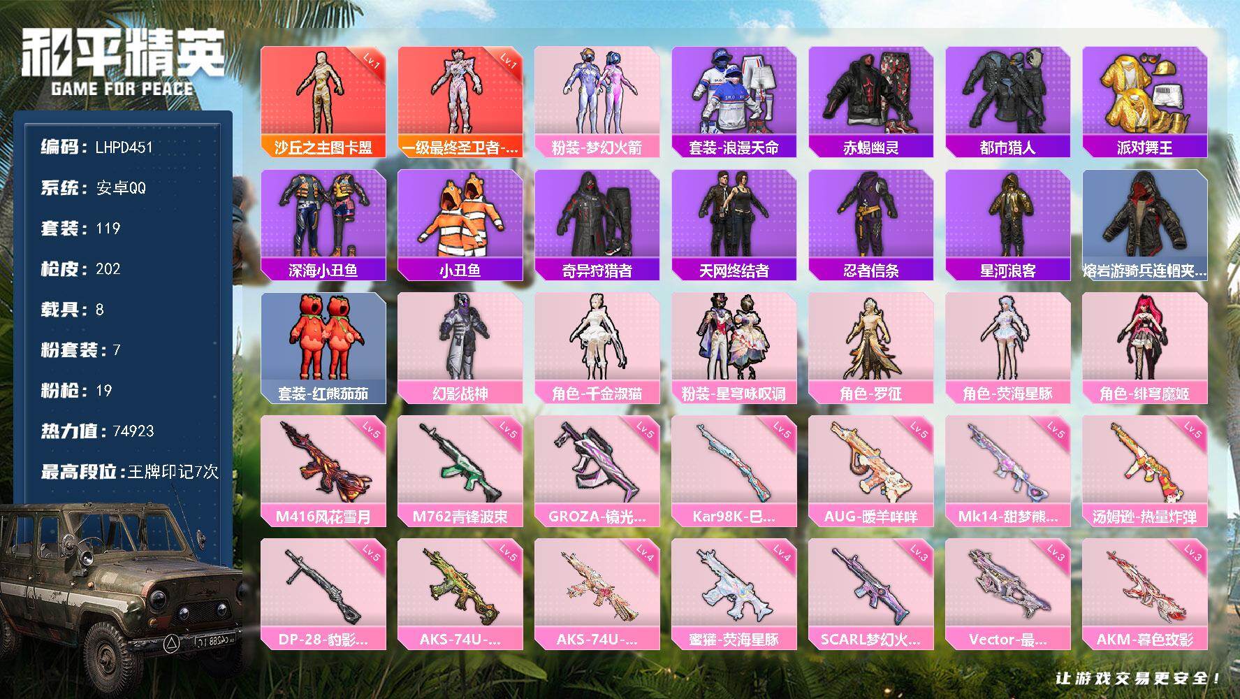 【店主推荐捡漏号!可直接换绑】安卓 手Q-2神装-7粉装-19特效枪-8载具-