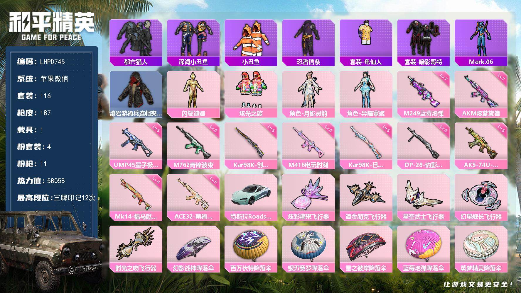 3载具 7升级枪 7粉装 1尾迹 236枪皮 195套装 91132热力 9印记,连体王者V8