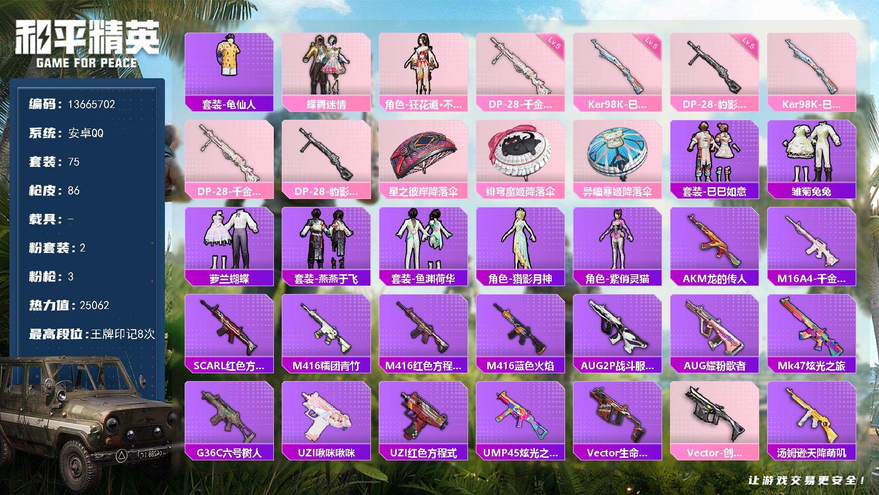 安卓 手Q-2粉装-6特效枪-0载具-1粉色飞行器-32649热力值-2王牌印