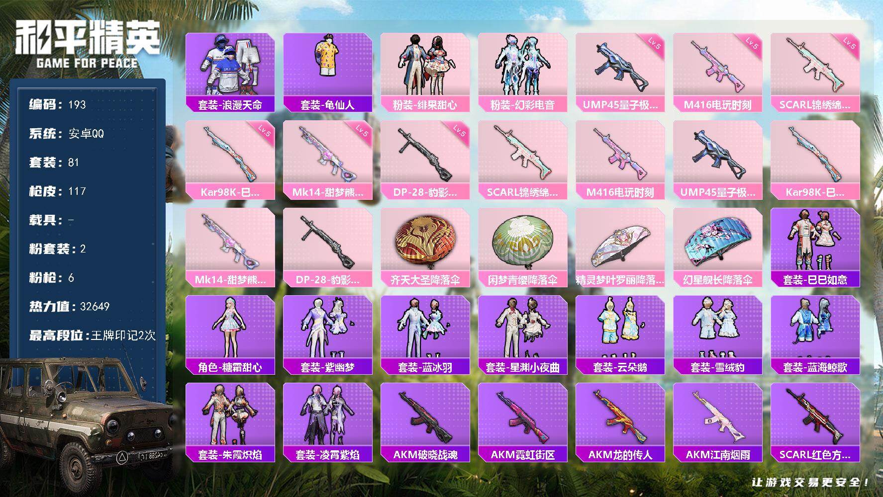 hs53374 安卓手Q-7王牌印记-1粉装-3特效枪-1载具-38591热力值-93套装-110枪