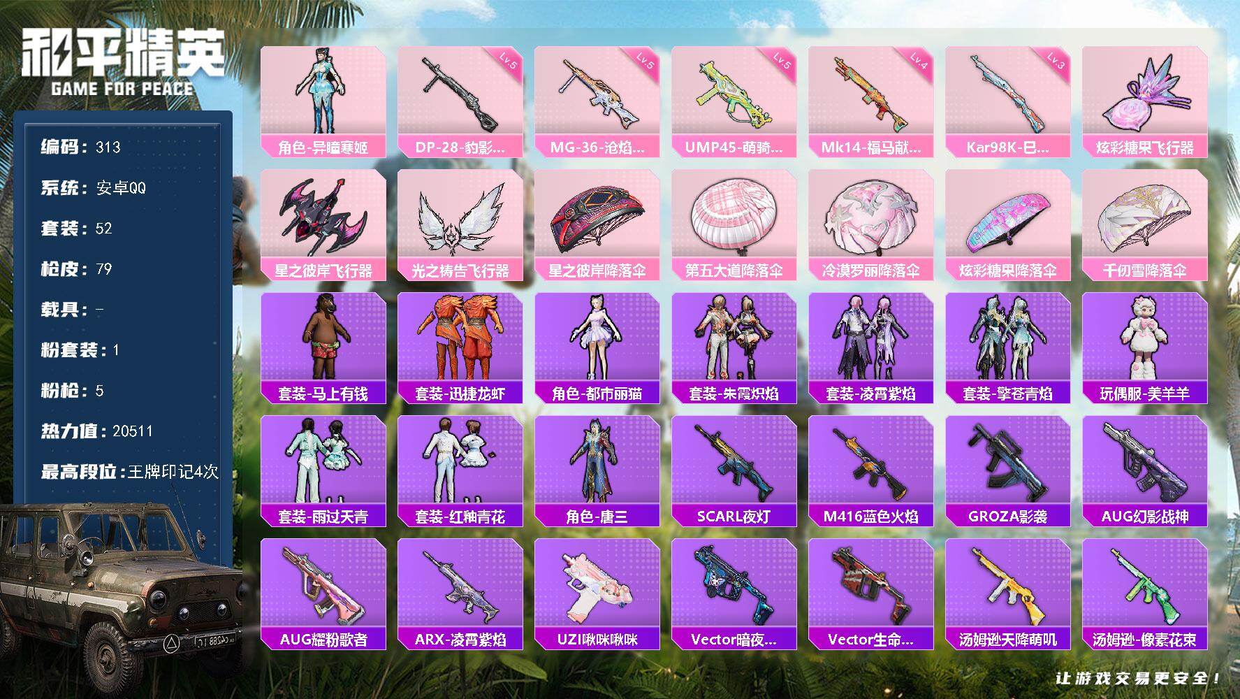 安卓 手Q-3粉装-5特效枪-0载具-0粉色飞行器-43714热力值-9王牌印