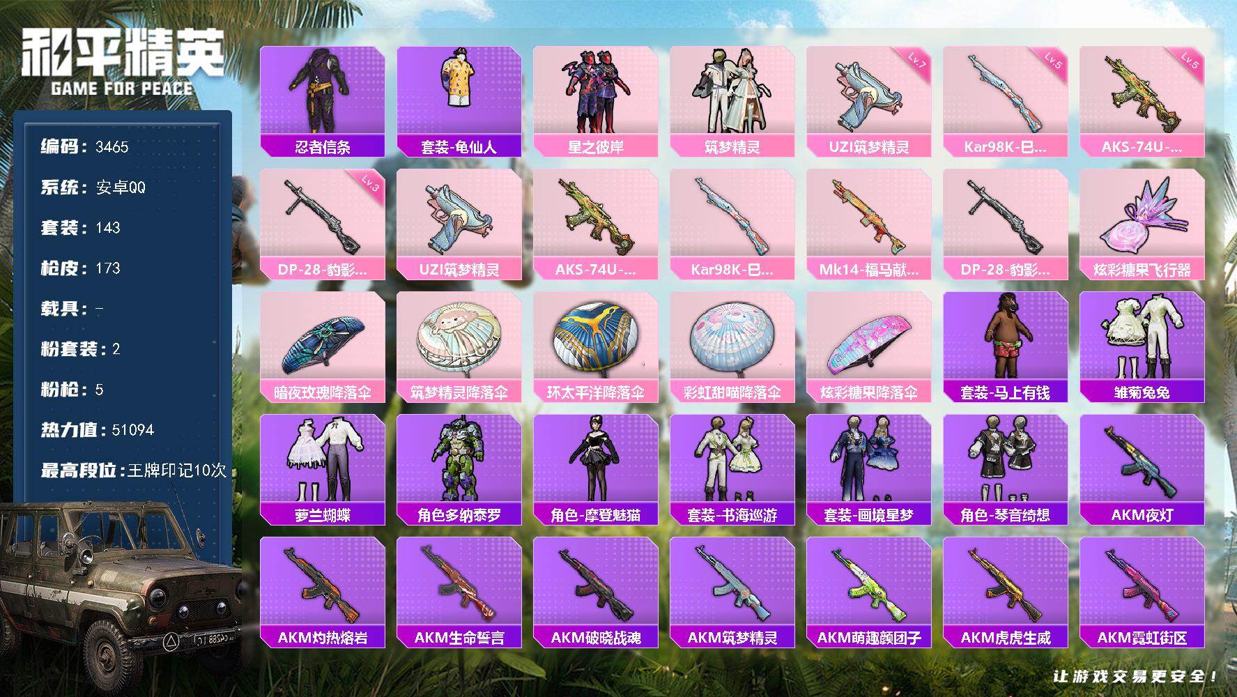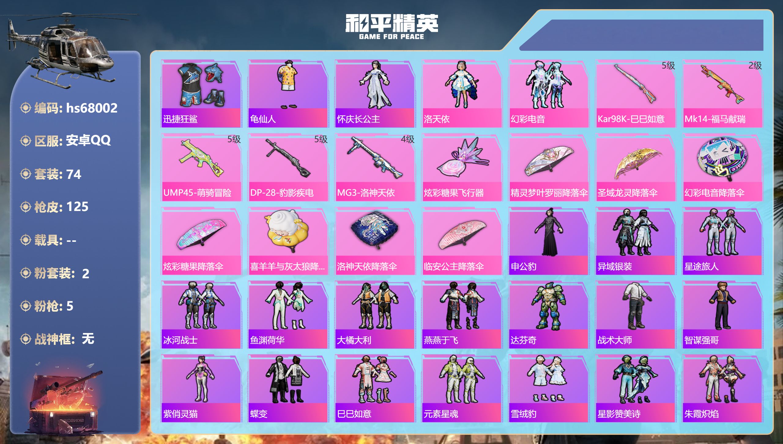 安卓 手Q-2粉装-3特效枪-0载具-1粉色飞行器-48557热力值-17王牌