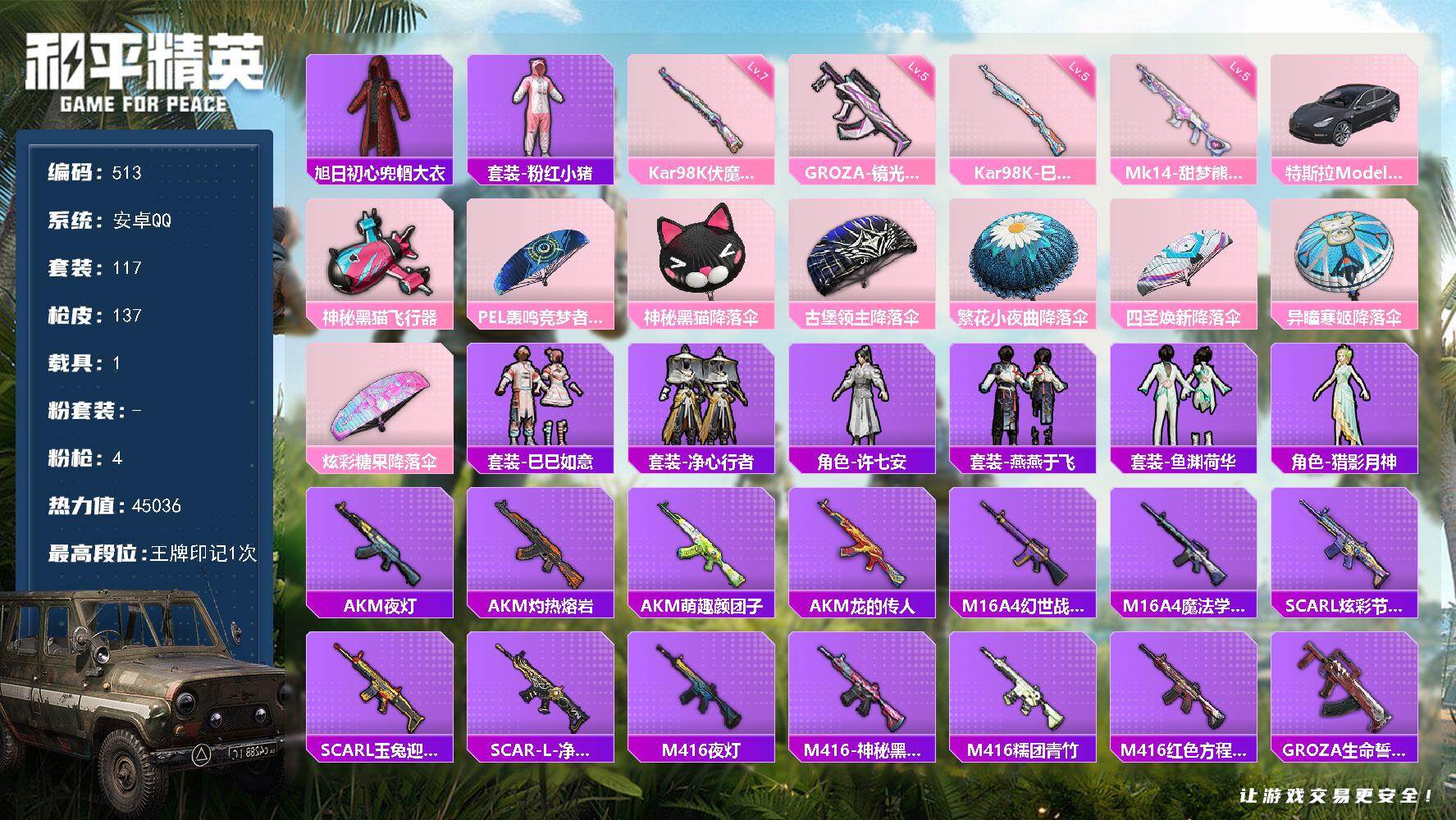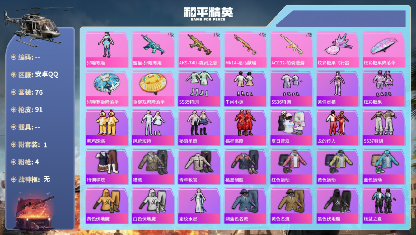 安卓 手Q-3粉装-6特效枪-0载具-1粉色飞行器-46500热力值-14王牌