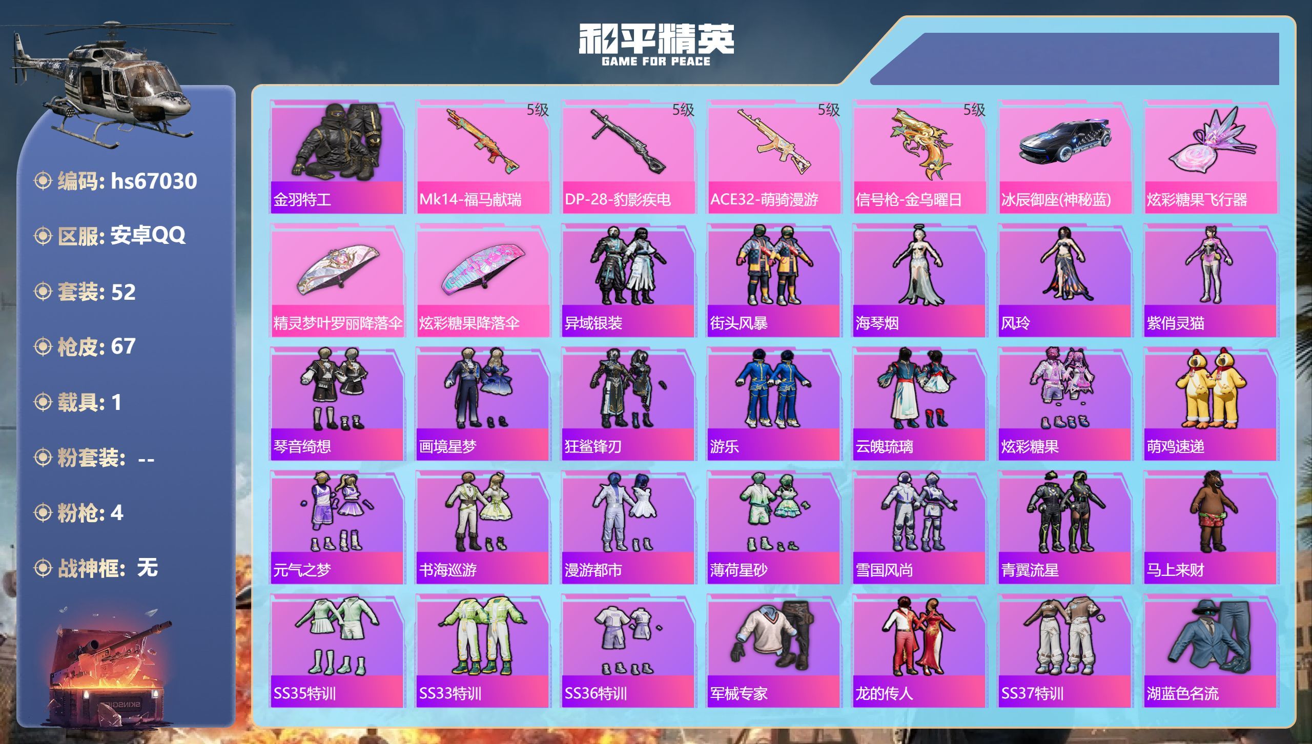 hs67030 苹果手Q-5王牌印记-4特效枪-1载具-18581热力值-52套装-67枪皮-1卓越