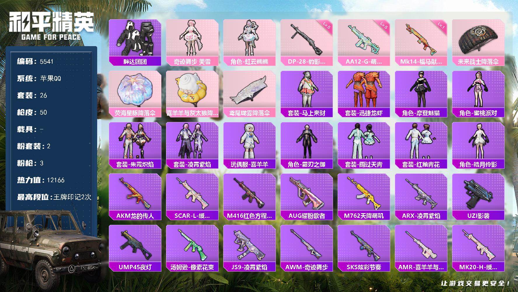 苹果 手Q-2粉装-3特效枪-0载具-0粉色飞行器-12166热力值-2王牌印