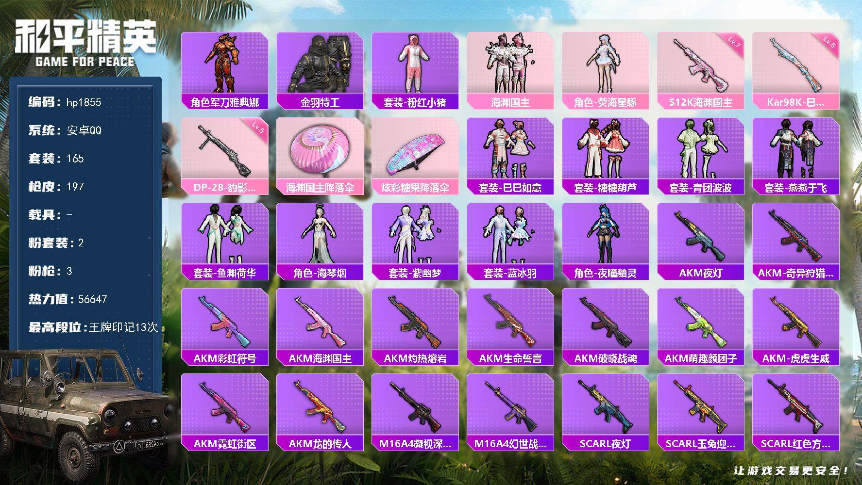 安卓 手Q-2粉装-3特效枪-0载具-0粉色飞行器-56647热力值-13王牌