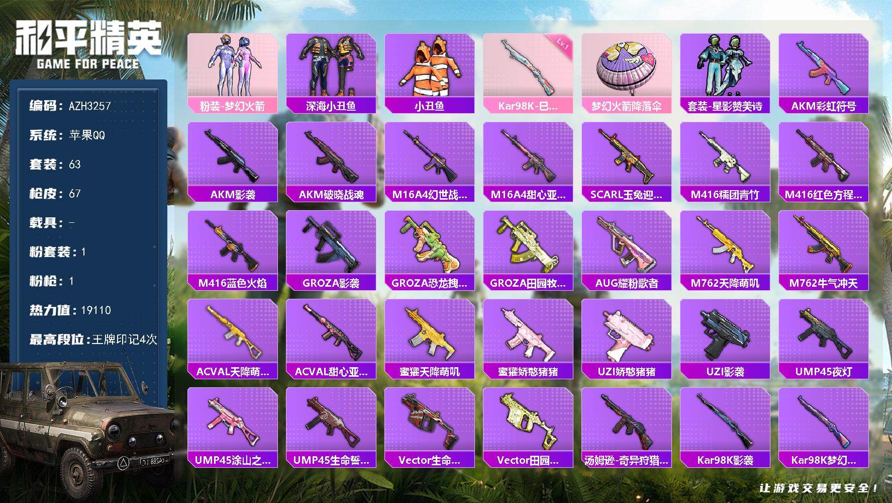 安卓 手Q-2粉装-7特效枪-0载具-1粉色飞行器-30841热力值-2王牌印