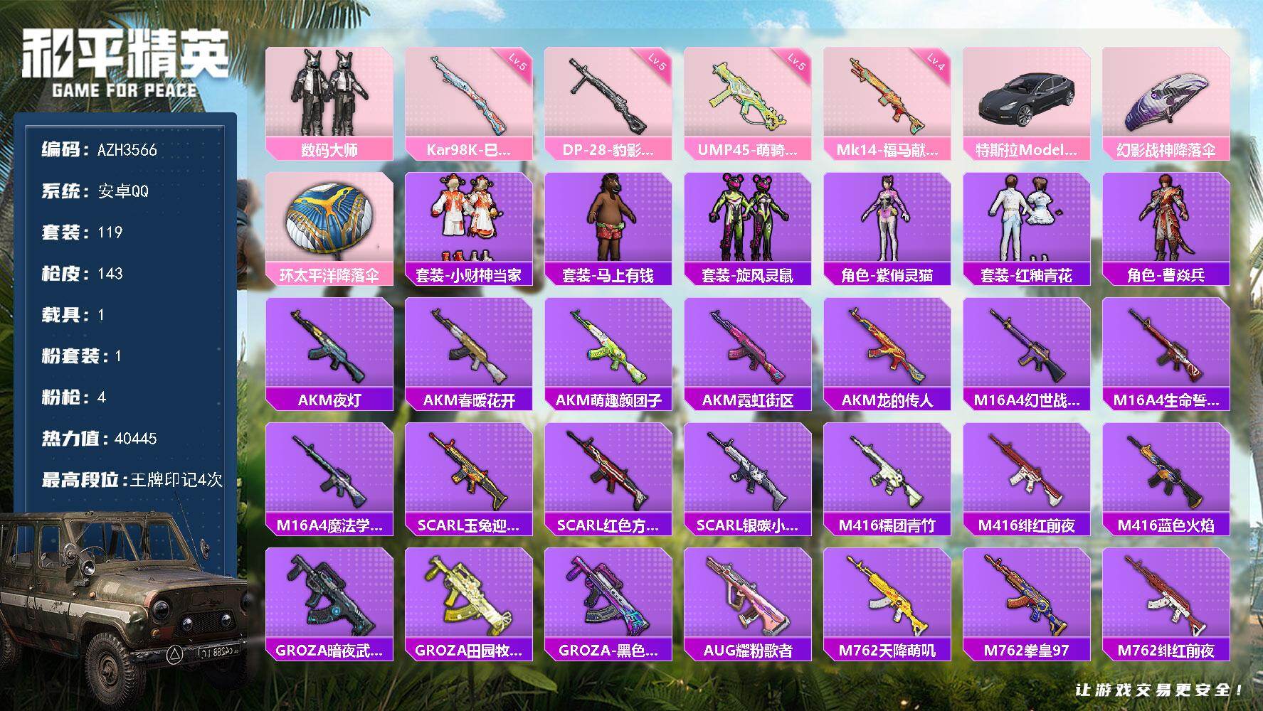 28套装/枪械4/装备27/战备25/王牌印记1/热力值9596/四级UMP4