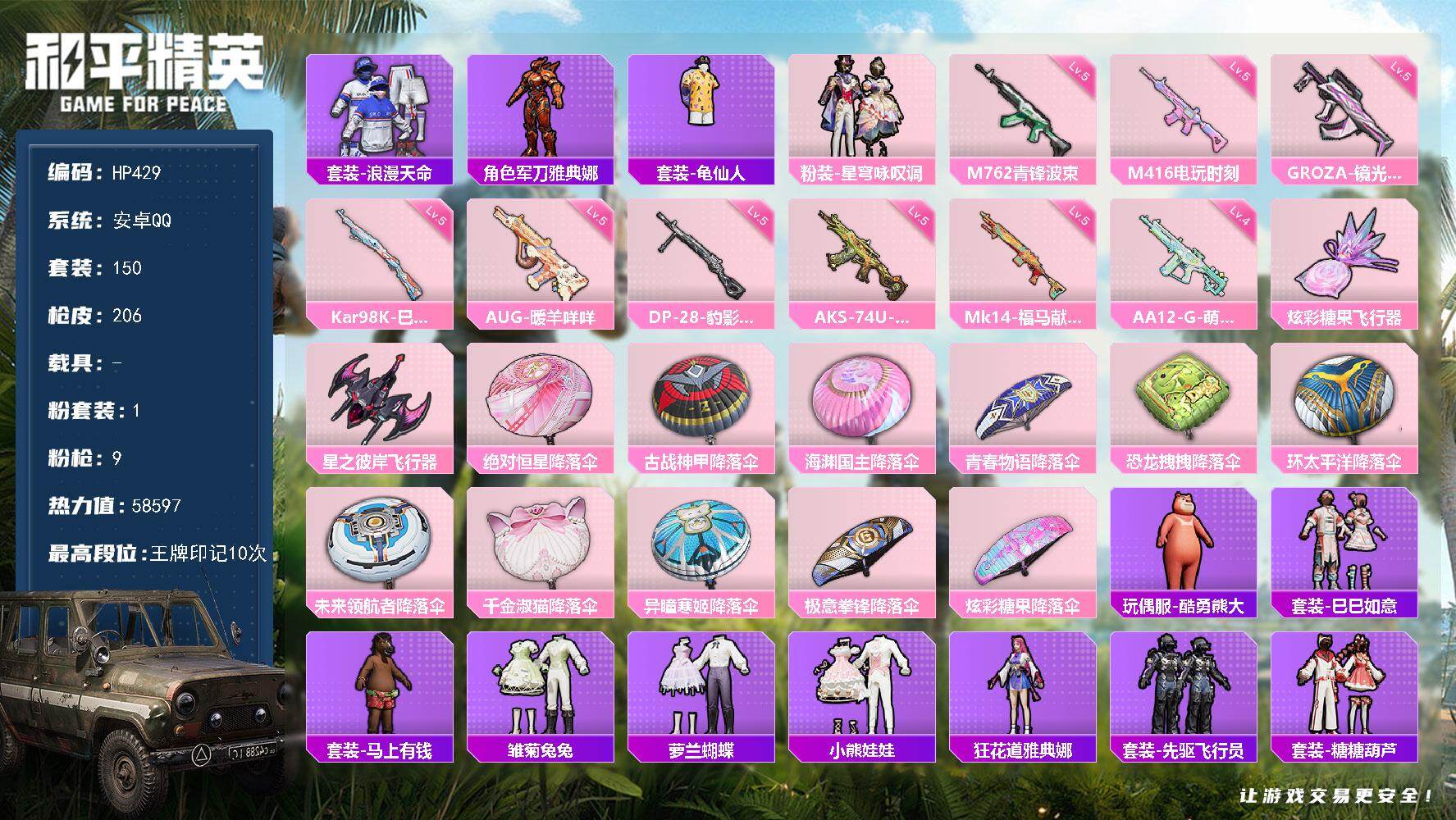 【秒换绑】安卓 手Q-1粉装-9特效枪-0载具-3粉色飞行器-58597热力值