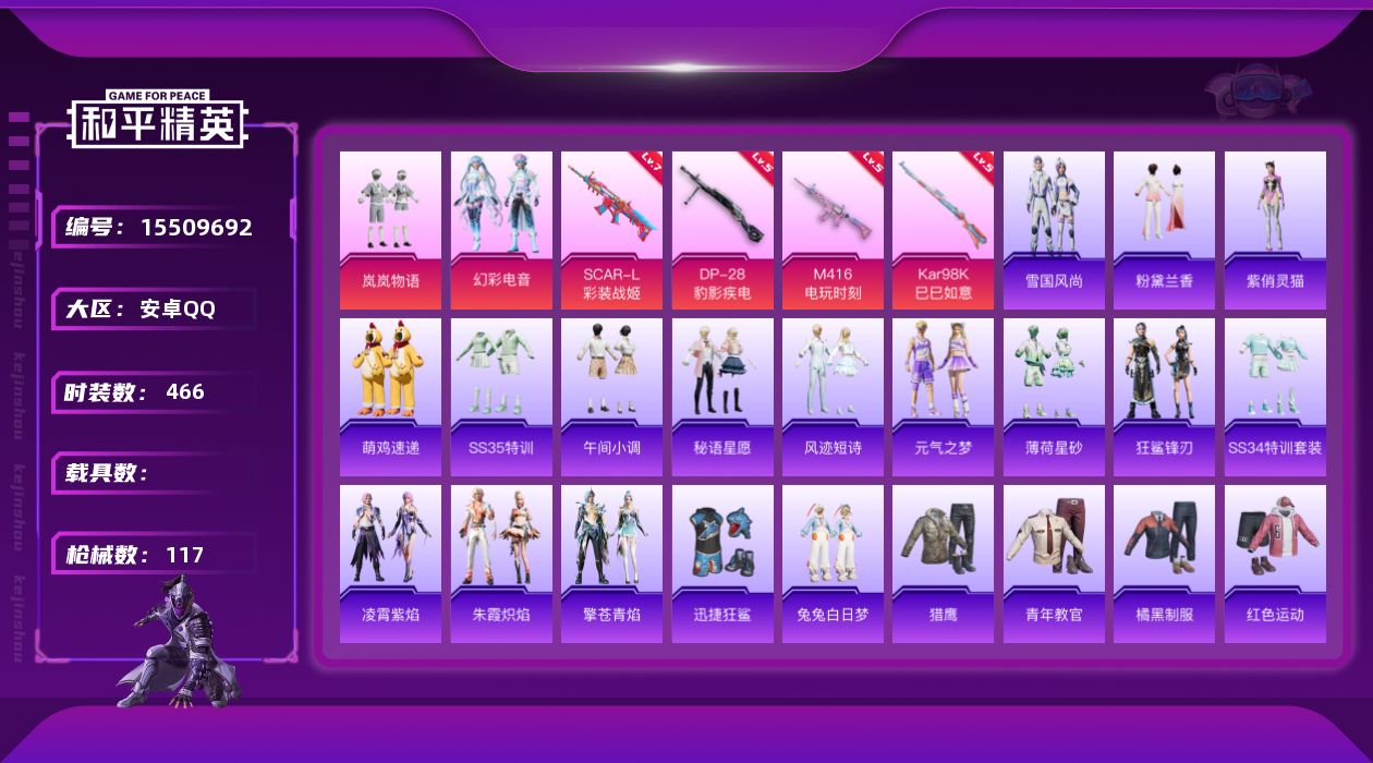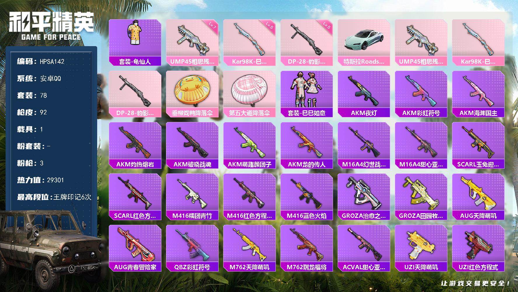 78套装/枪械3/装备82/载具1/战备68/王牌印记6/热力值29301