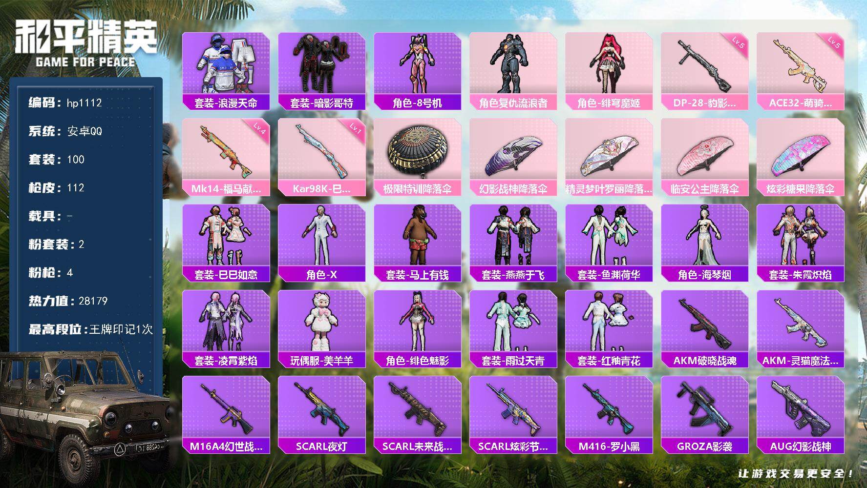 安卓 手Q-2粉装-4特效枪-0载具-0粉色飞行器-28179热力值-1王牌印