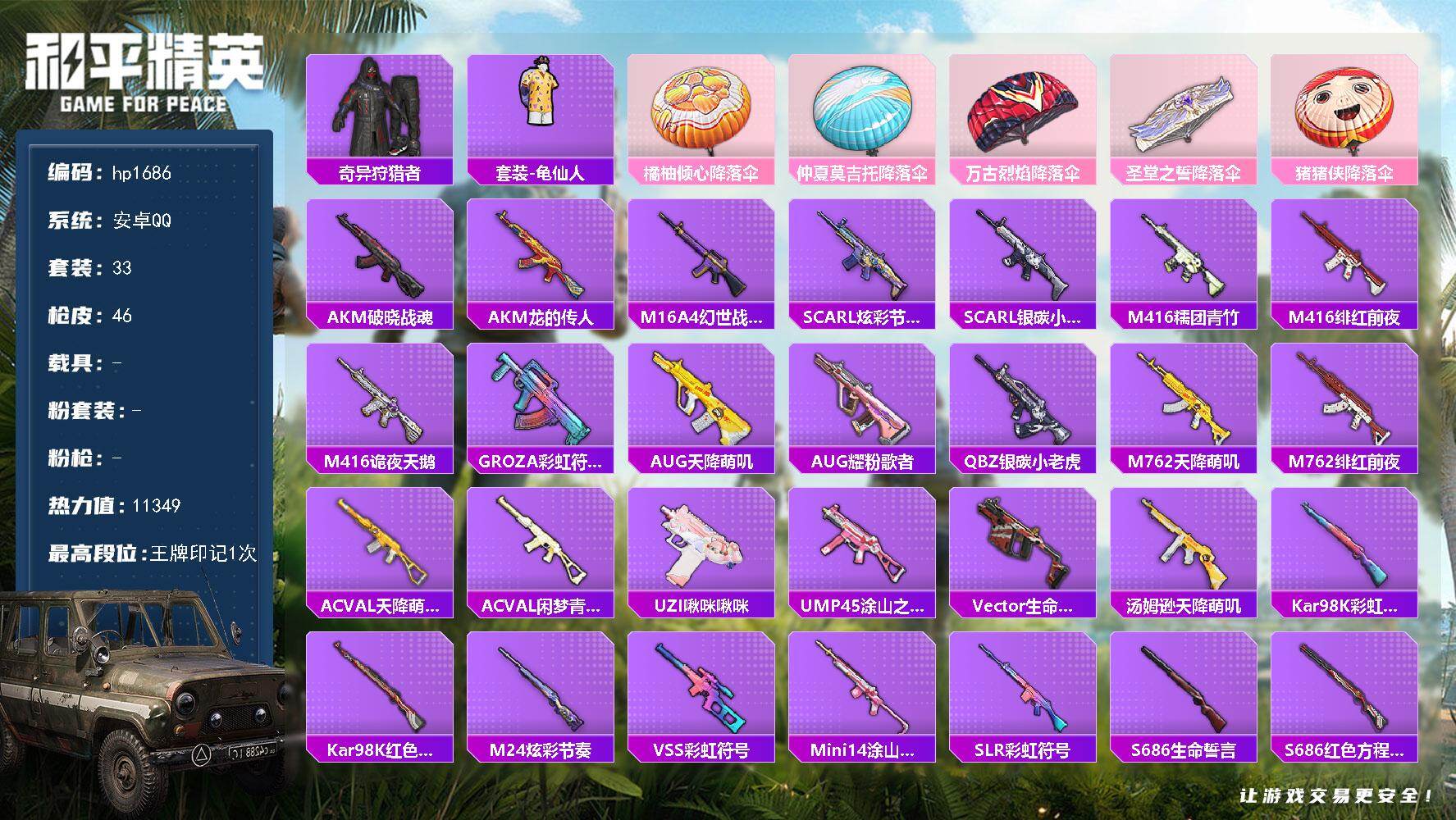 安卓 手Q-0粉装-0特效枪-0载具-0粉色飞行器-11349热力值-1王牌印
