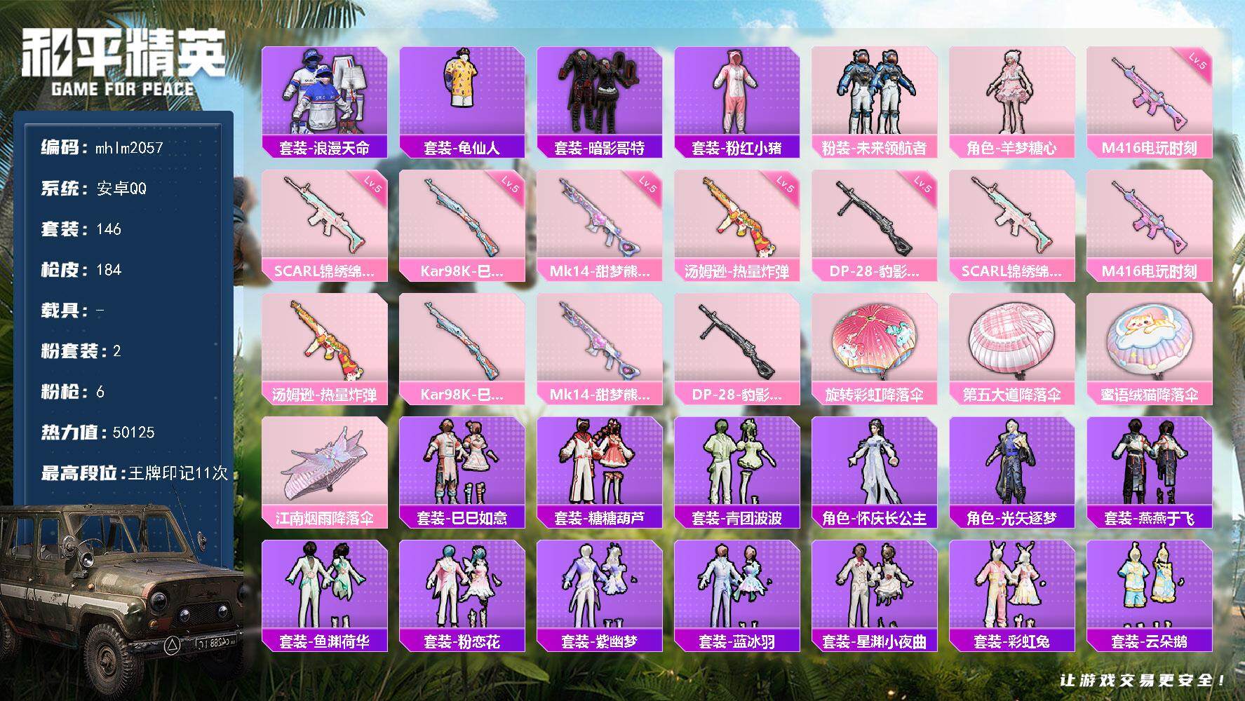 安卓 手Q-5粉装-1特效枪-0载具-2粉色飞行器-58792热力值-4王牌印