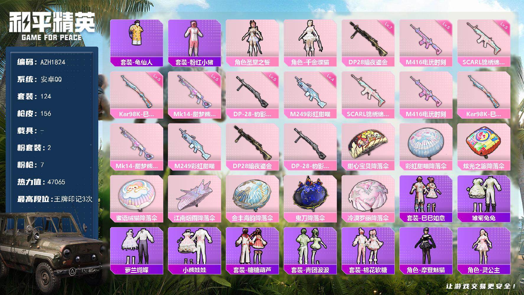 hs47205 安卓手Q-7王牌印记-1粉装-3特效枪-1载具-36723热力值-87套装-104枪