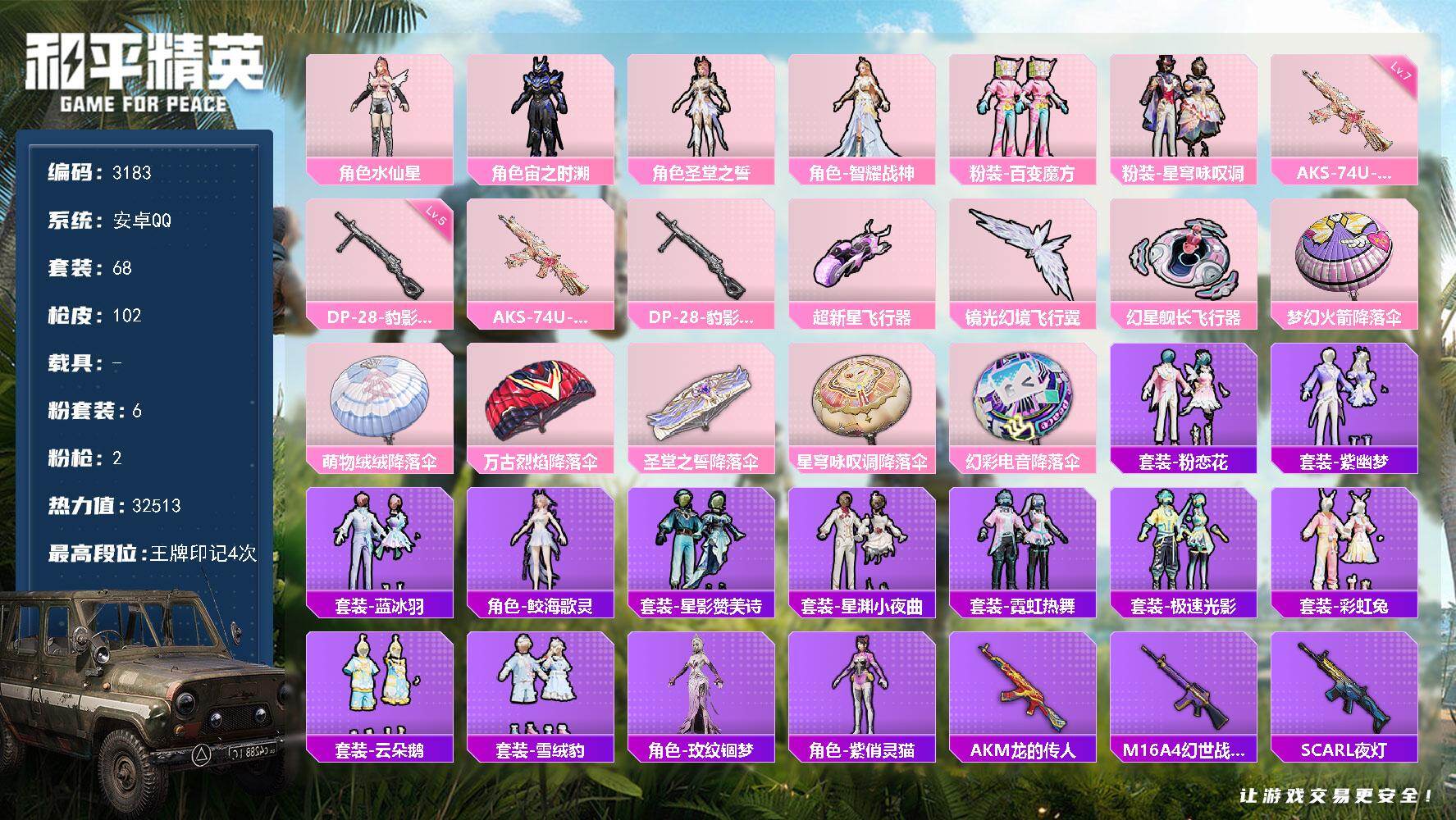 安卓 手Q-6粉装-2特效枪-0载具-4粉色飞行器-32513热力值-4王牌印