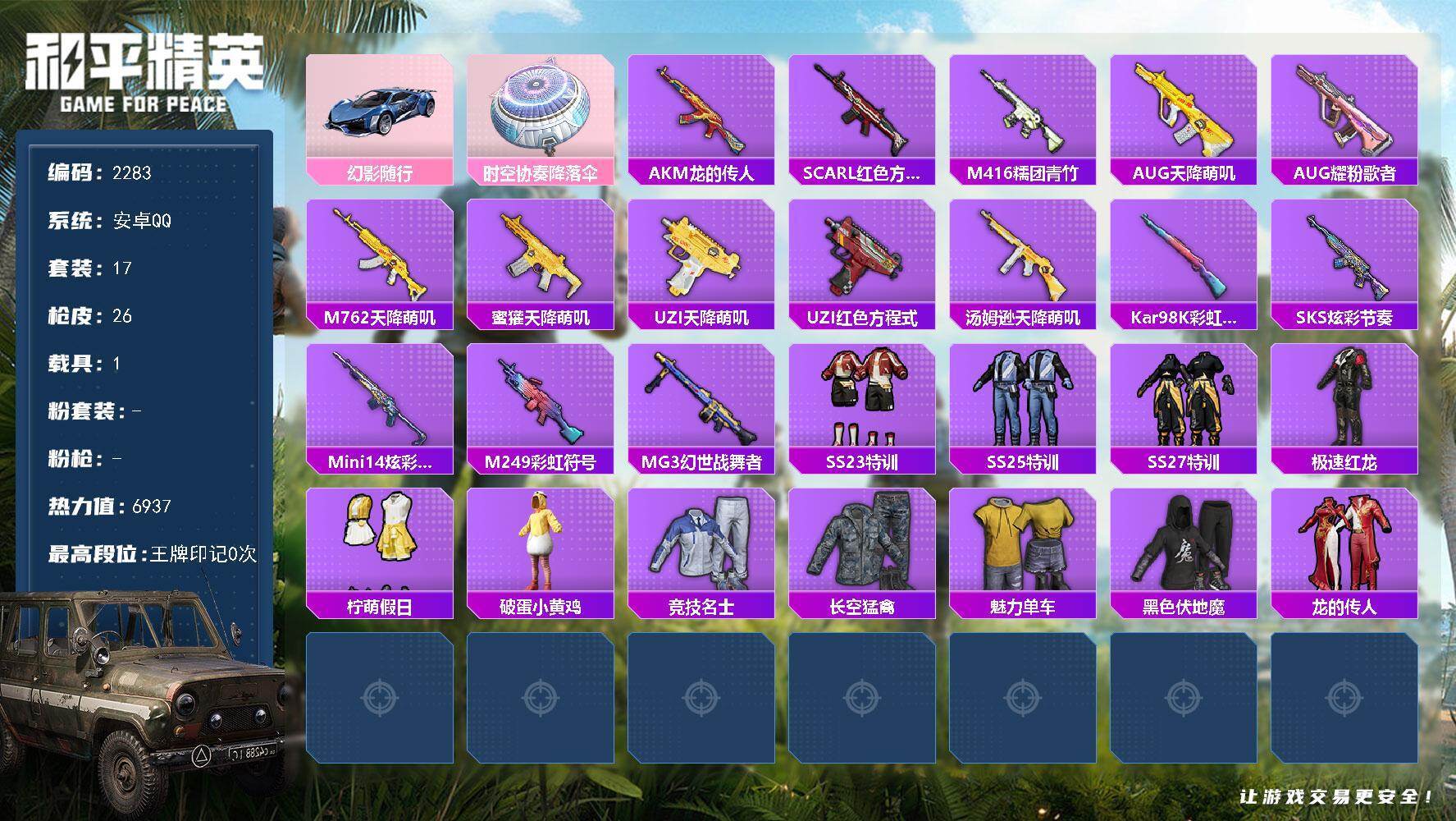 安卓 手Q-3粉装-7特效枪-0载具-1粉色飞行器-56916热力值-15王牌