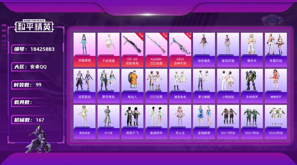 时装数: 73 载具数: 1 枪械数: 84 战备数: 55 热门装扮: 千金