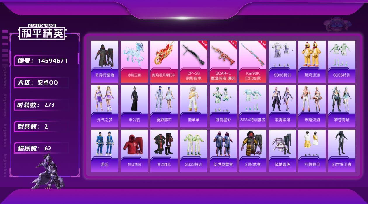 hs50841 安卓手Q-0王牌印记-2粉装-3特效枪-1载具-26102热力值-61套装-73枪皮