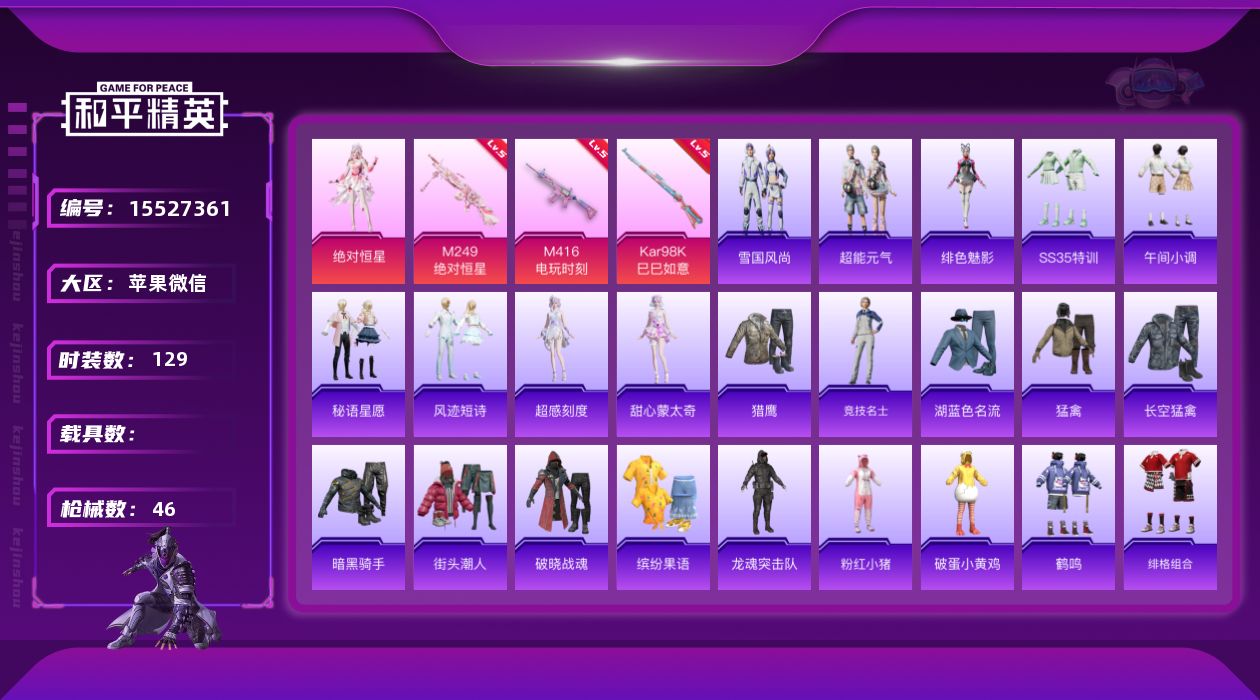 苹果 手Q-2粉装-1特效枪-0载具-1粉色飞行器-8725热力值-1王牌印记