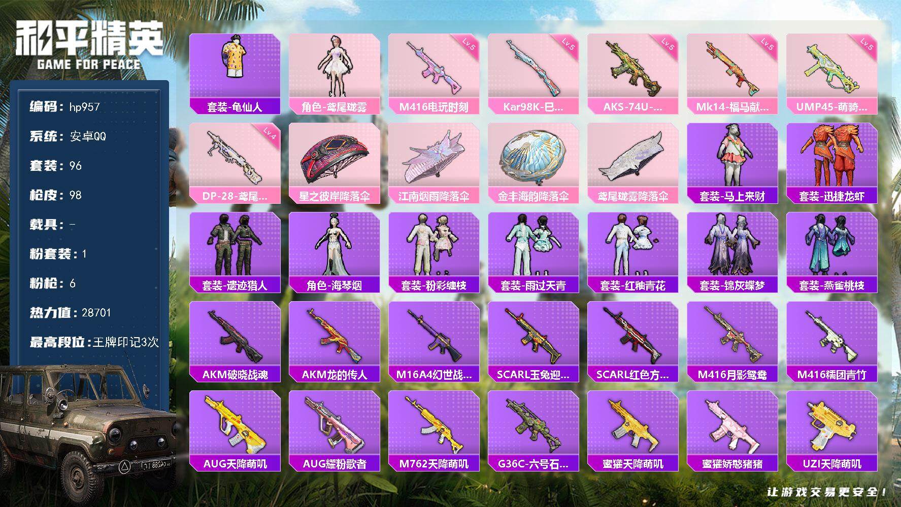 安卓 手Q-1粉装-6特效枪-0载具-0粉色飞行器-28701热力值-3王牌印