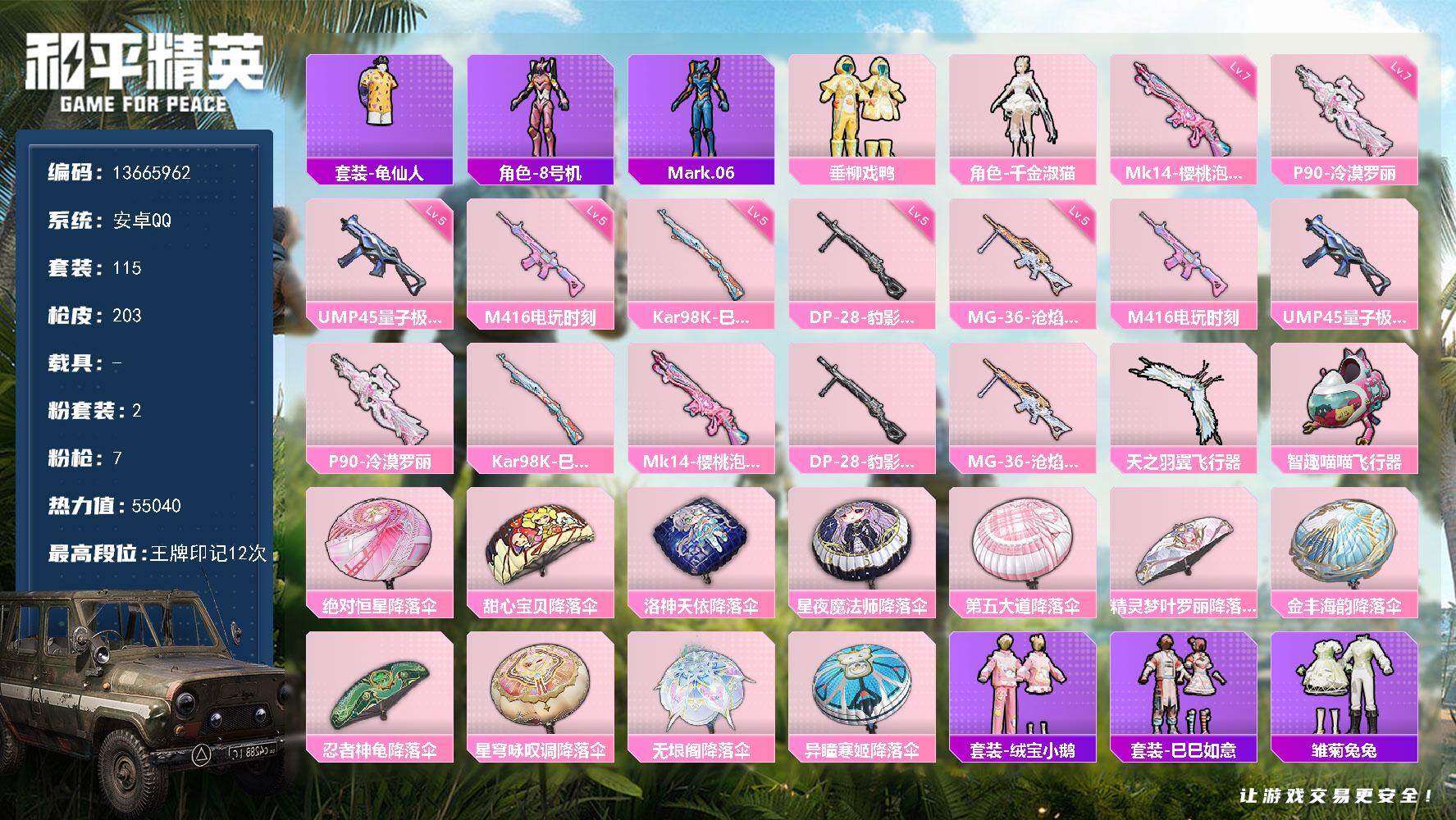 115套装/枪械7/装备231/战备137/王牌印记12/热力值55040/五