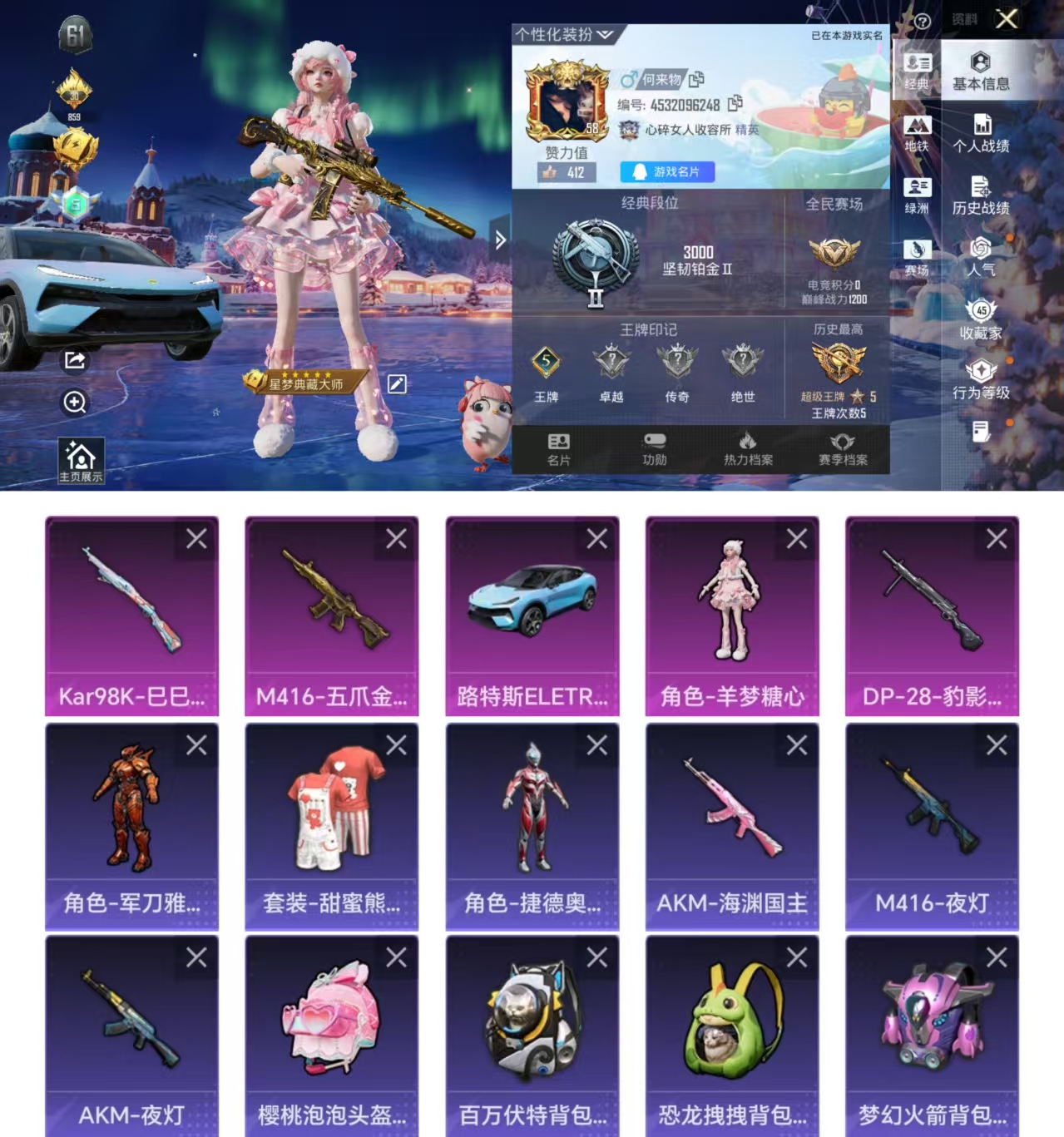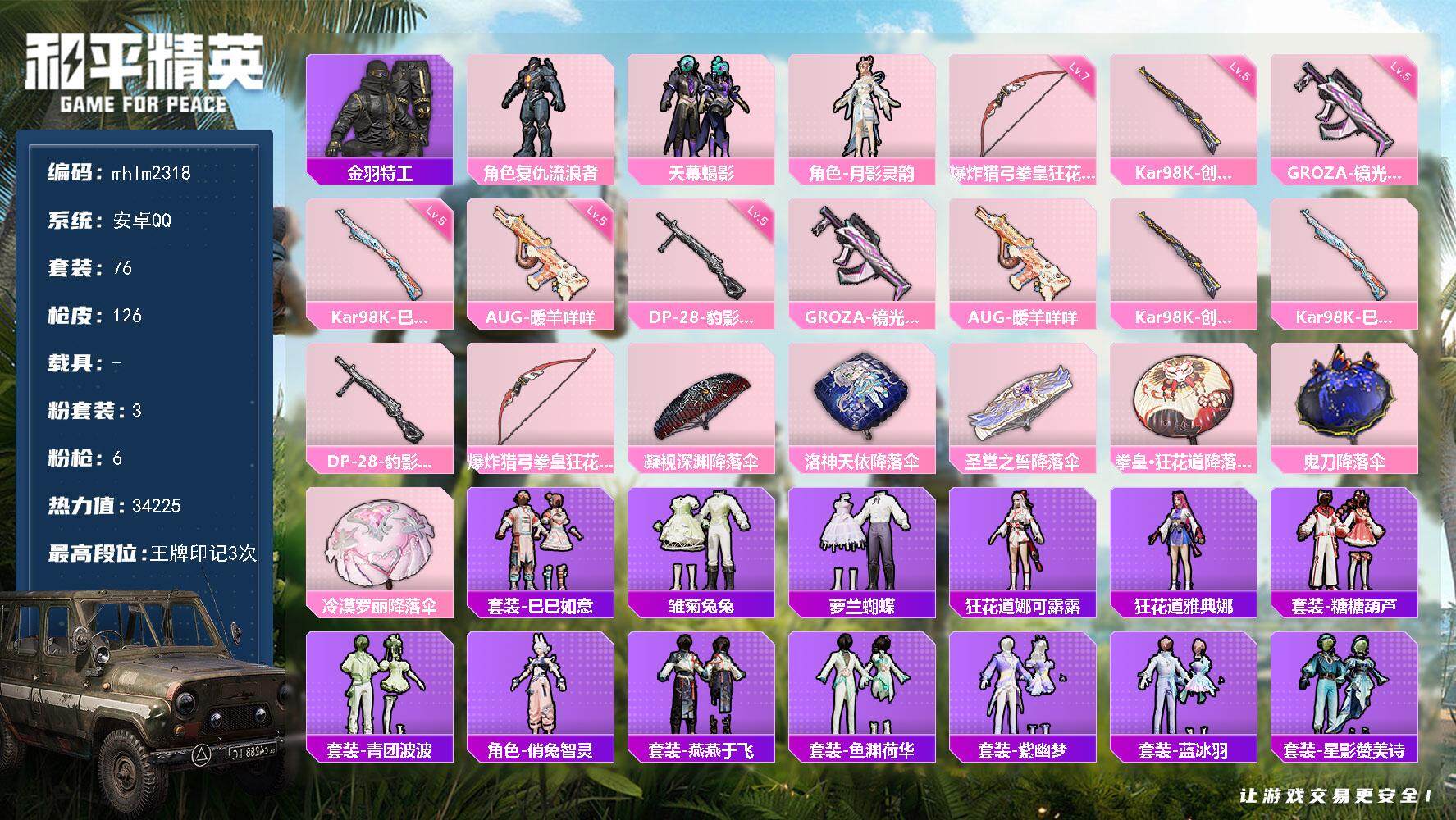1粉装-4特效枪-0载具-0粉色飞行器-34004热力值-1王牌印记-116套装-112枪皮