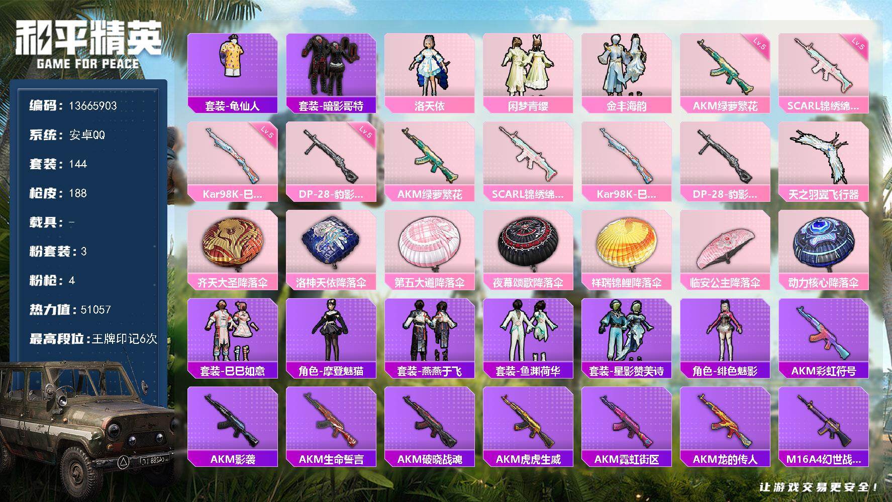hs47177 安卓手Q-0王牌印记-5粉装-3特效枪-1载具-30209热力值-59套装-90枪皮