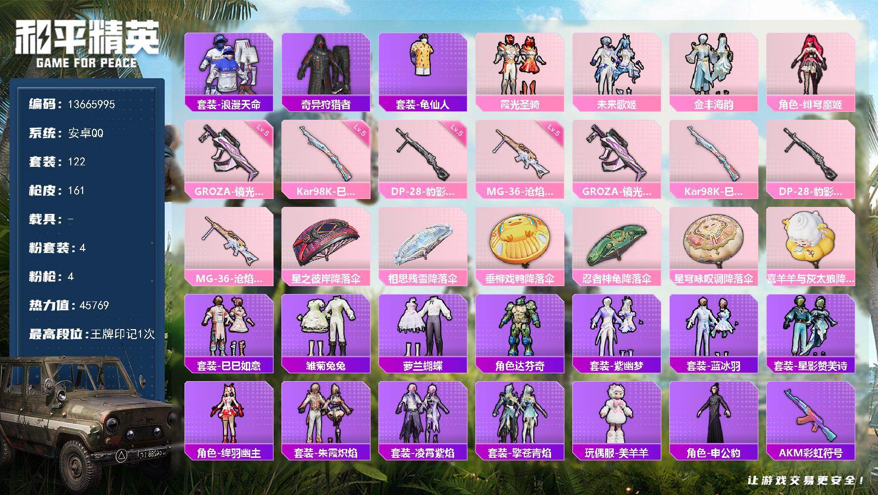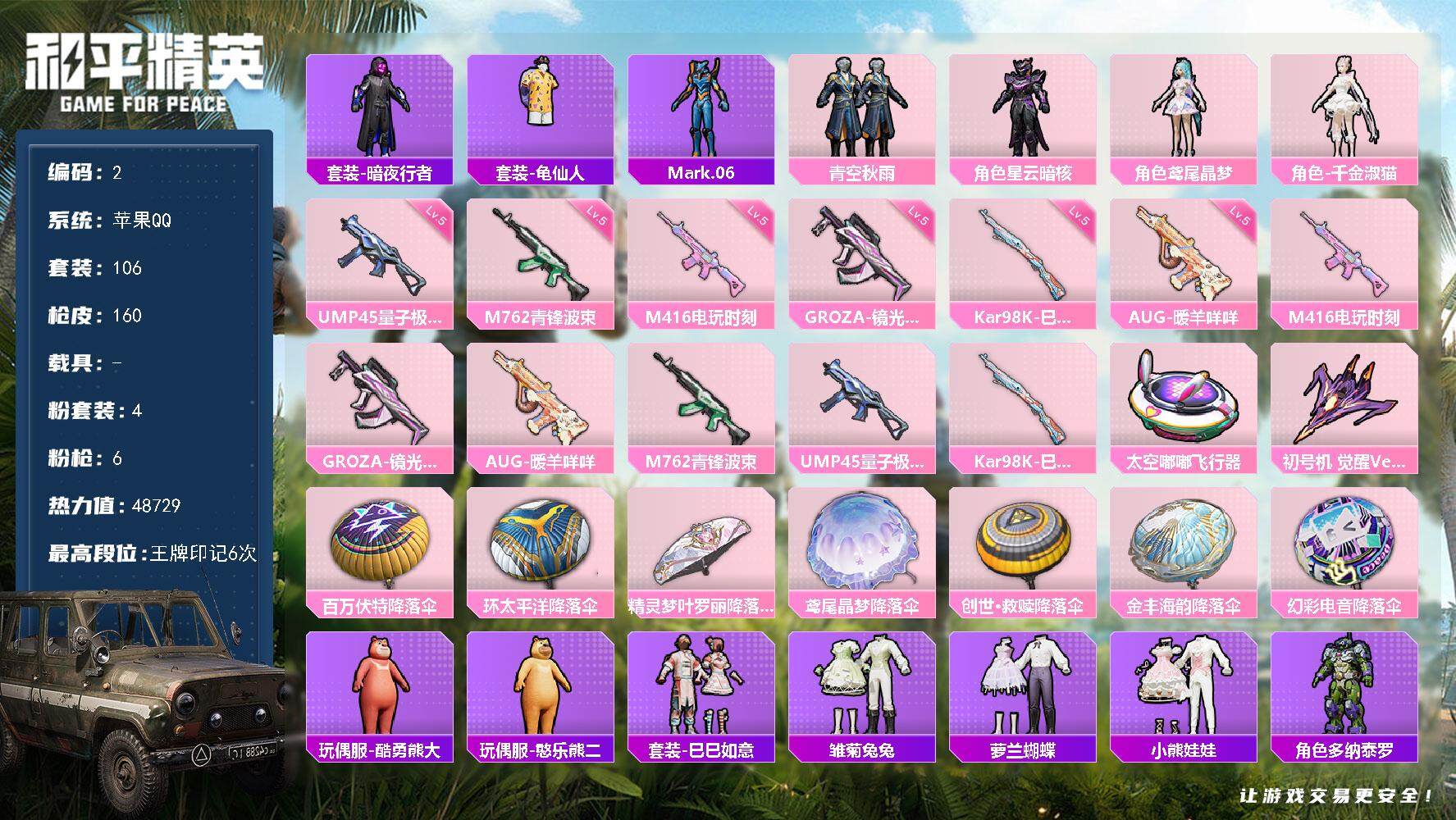 (可二次实名)苹果Q-1稀有3载具1粉装2特效枪7热门65套