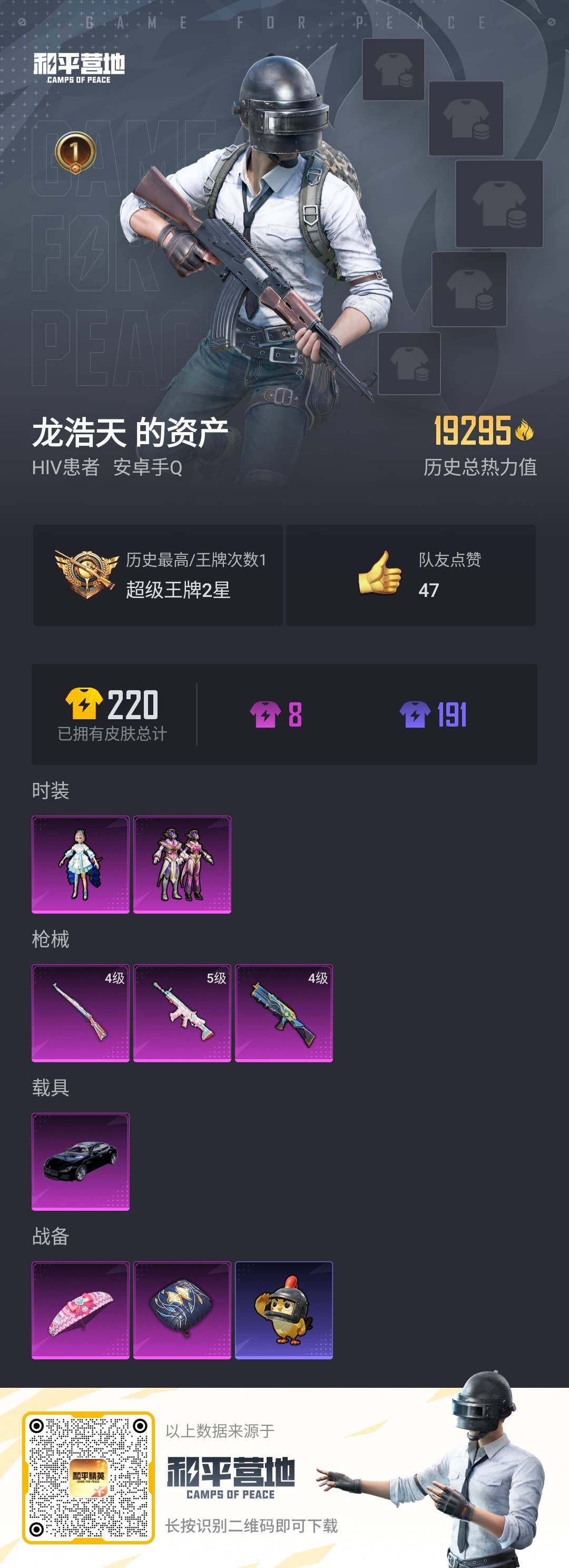 安卓 手Q-2粉装-3特效枪-1载具-0粉色飞行器-19295热力值-1王牌印