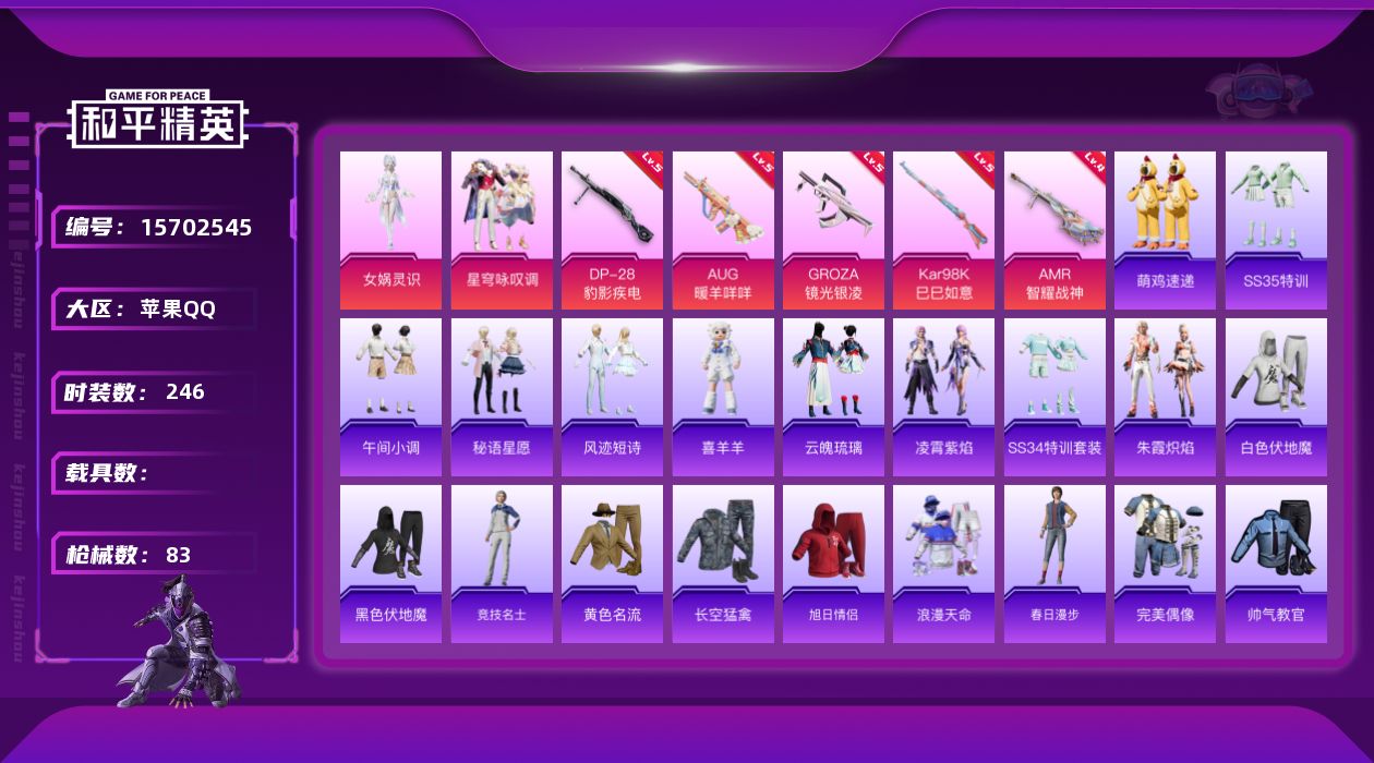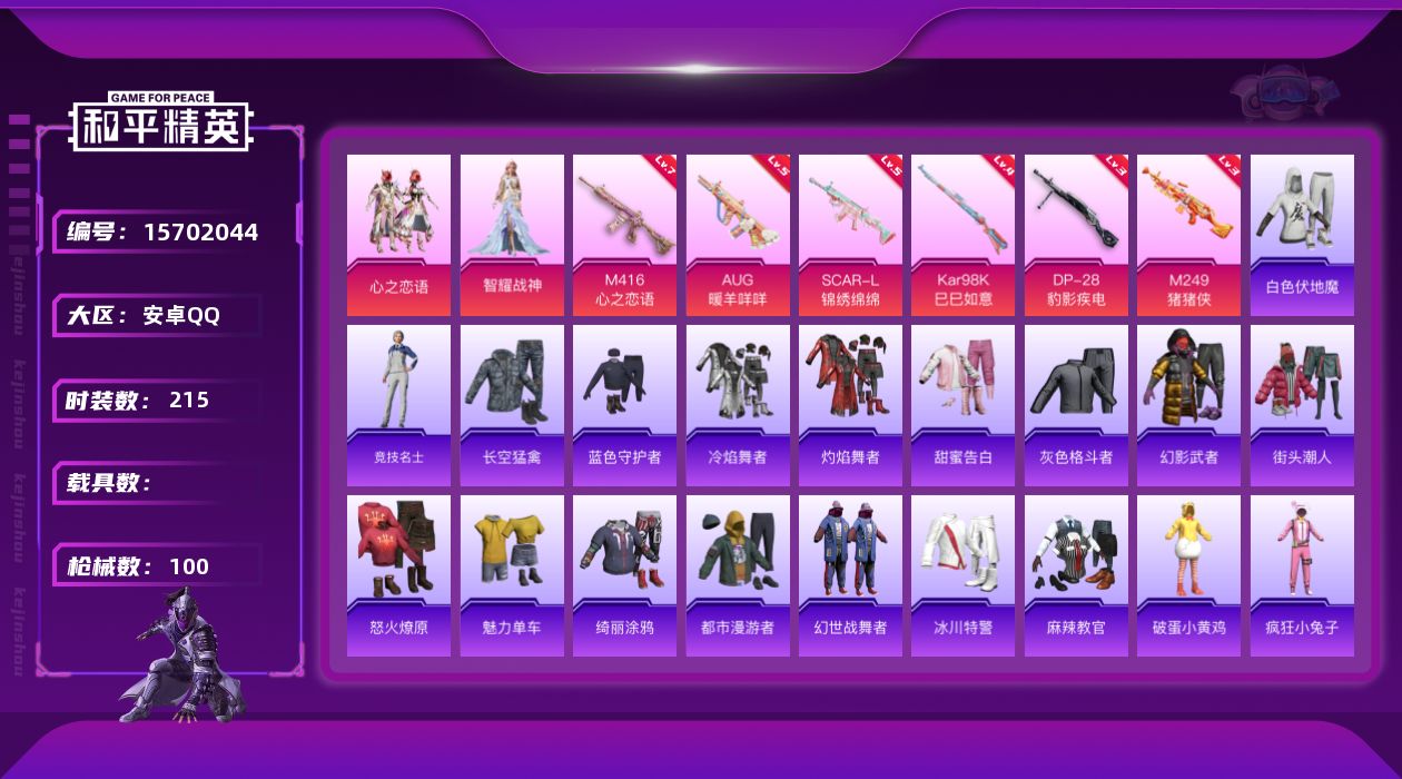 手Q-0粉装-2特效枪-0载具-0粉色飞行器-28886热力值-1王牌印记