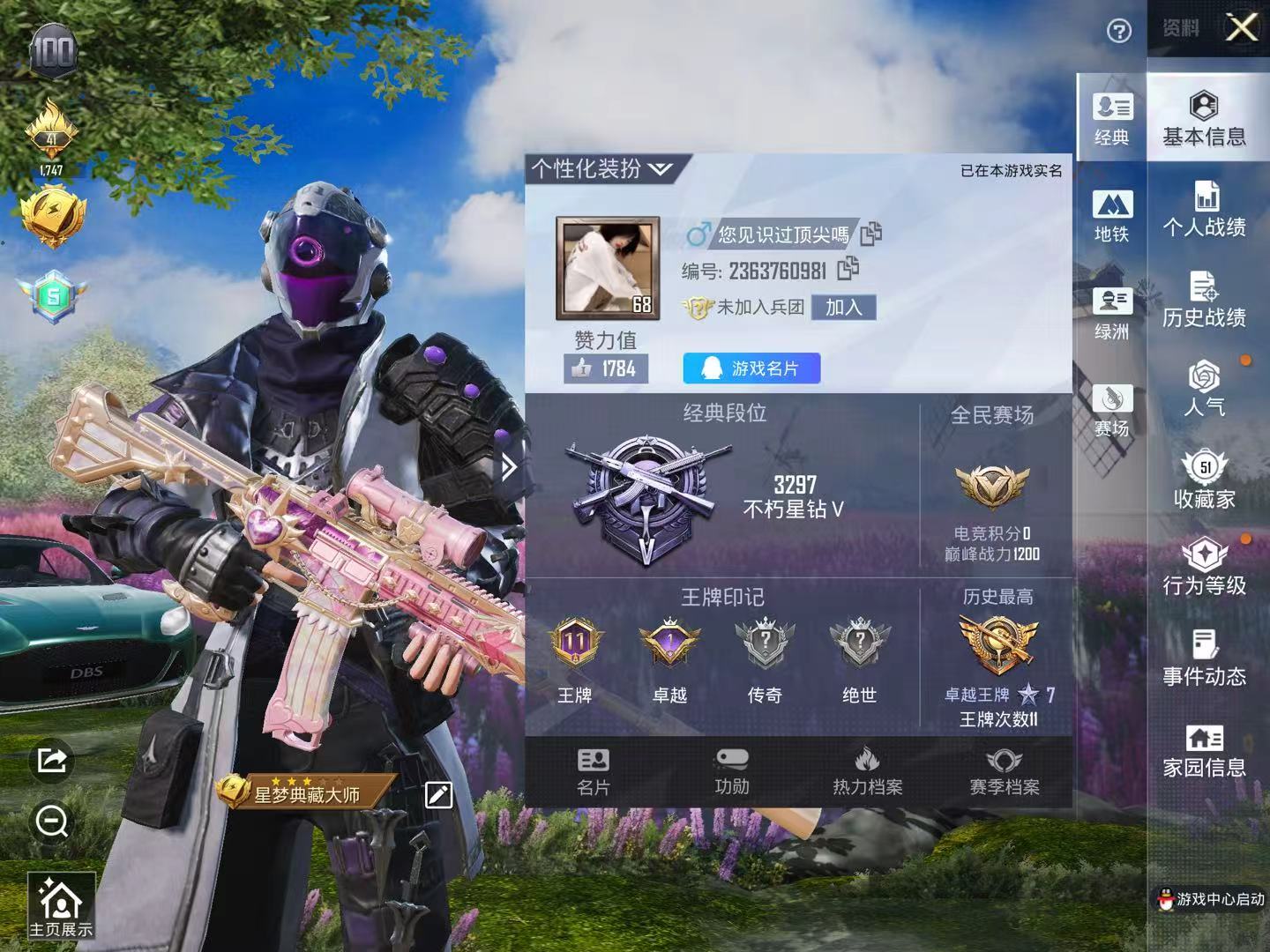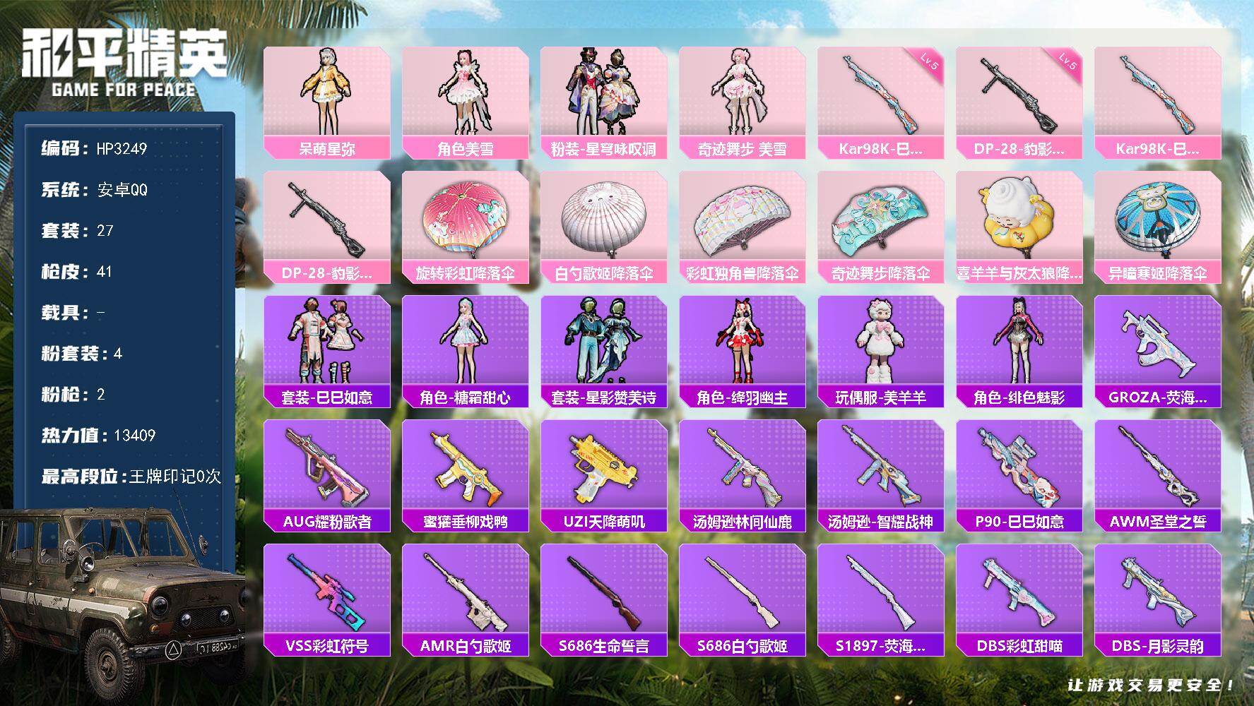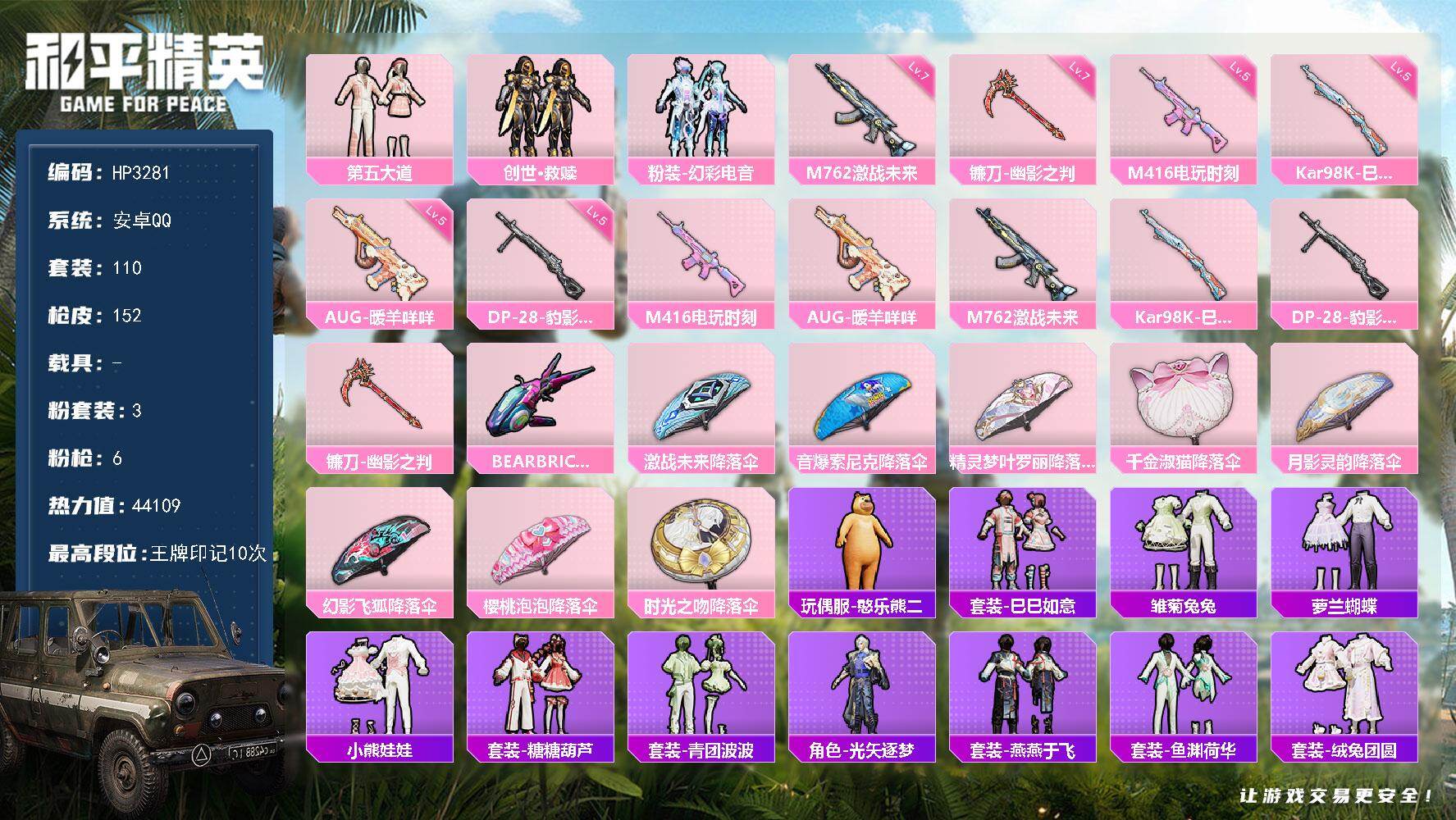 安卓 手Q-3粉装-6特效枪-0载具-2粉色飞行器-44109热力值-10王牌