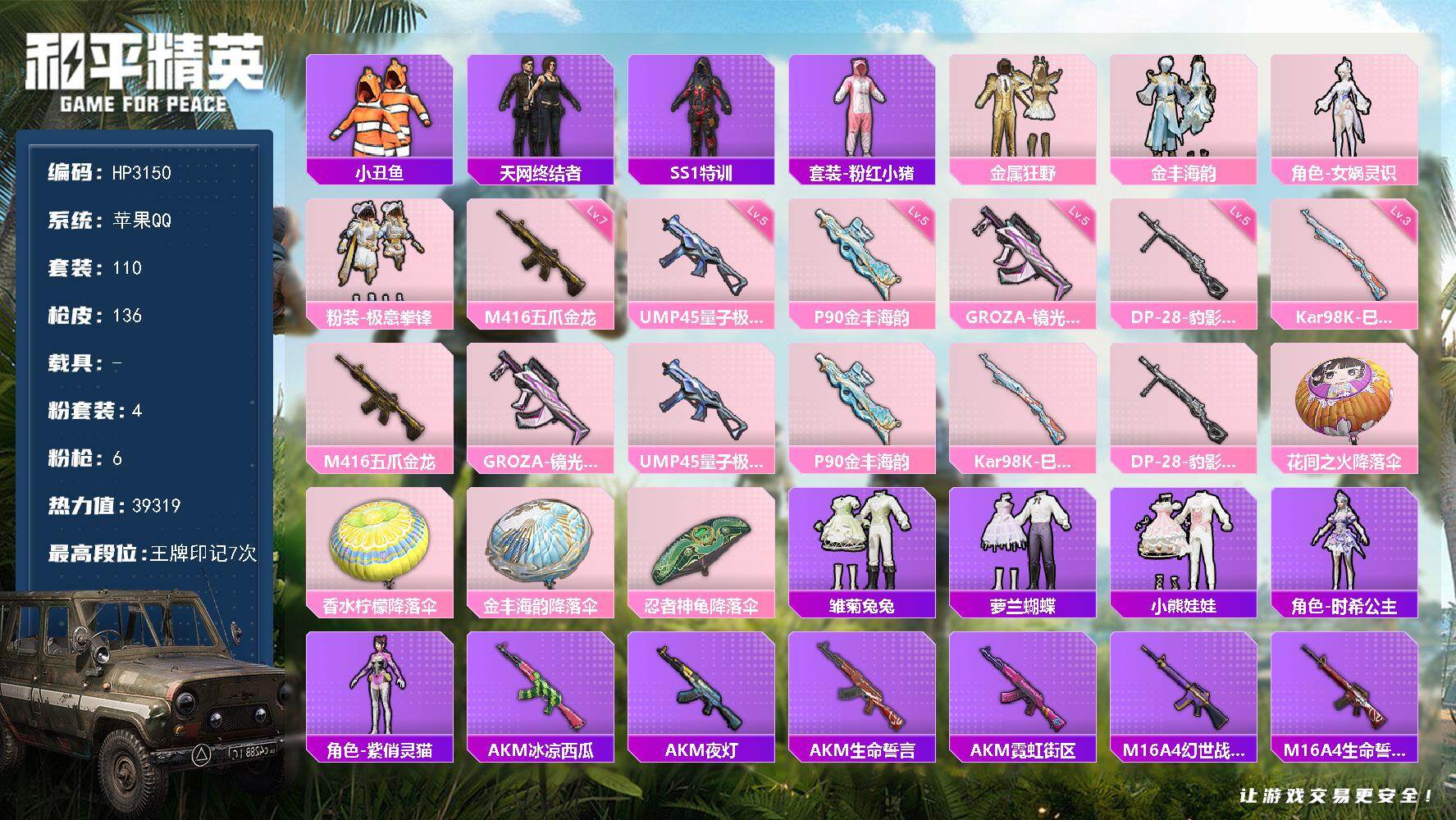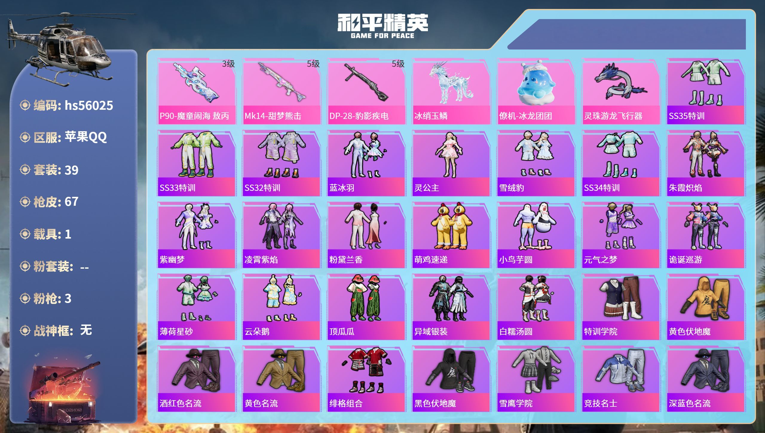 hs56025 苹果手Q-3王牌印记-3特效枪-1载具-17724热力值-39套装-67枪皮【3特效