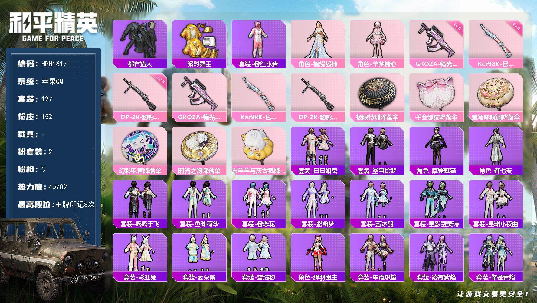 hs56141 苹果手Q-4王牌印记-2粉装-2特效枪-1载具-50249热力值-136套装-152