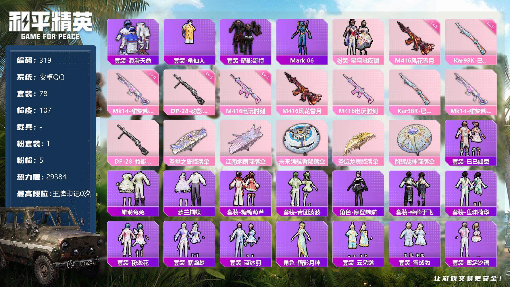 hs50494 安卓手Q-0王牌印记-2粉装-4特效枪-1载具-39950热力值-109套装-124