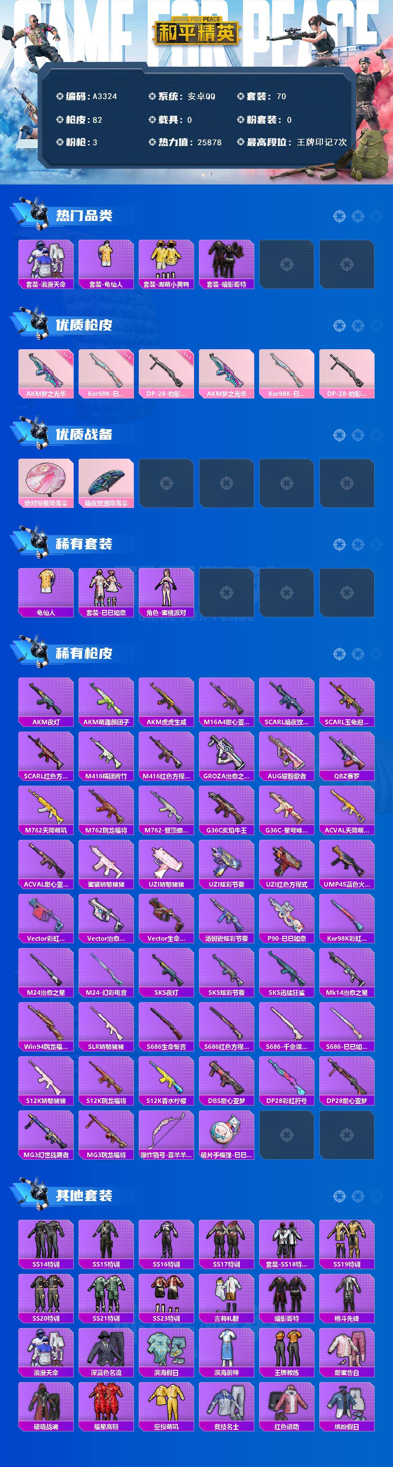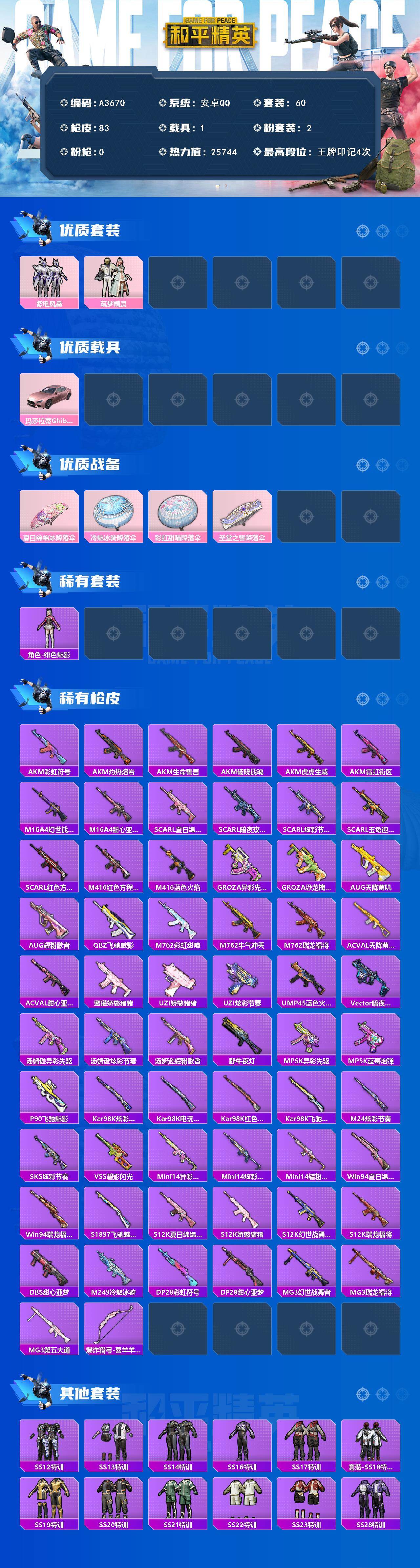 hs46437 安卓手Q-6王牌印记-0粉装-3特效枪-1载具-25439热力值-65套装-80枪皮