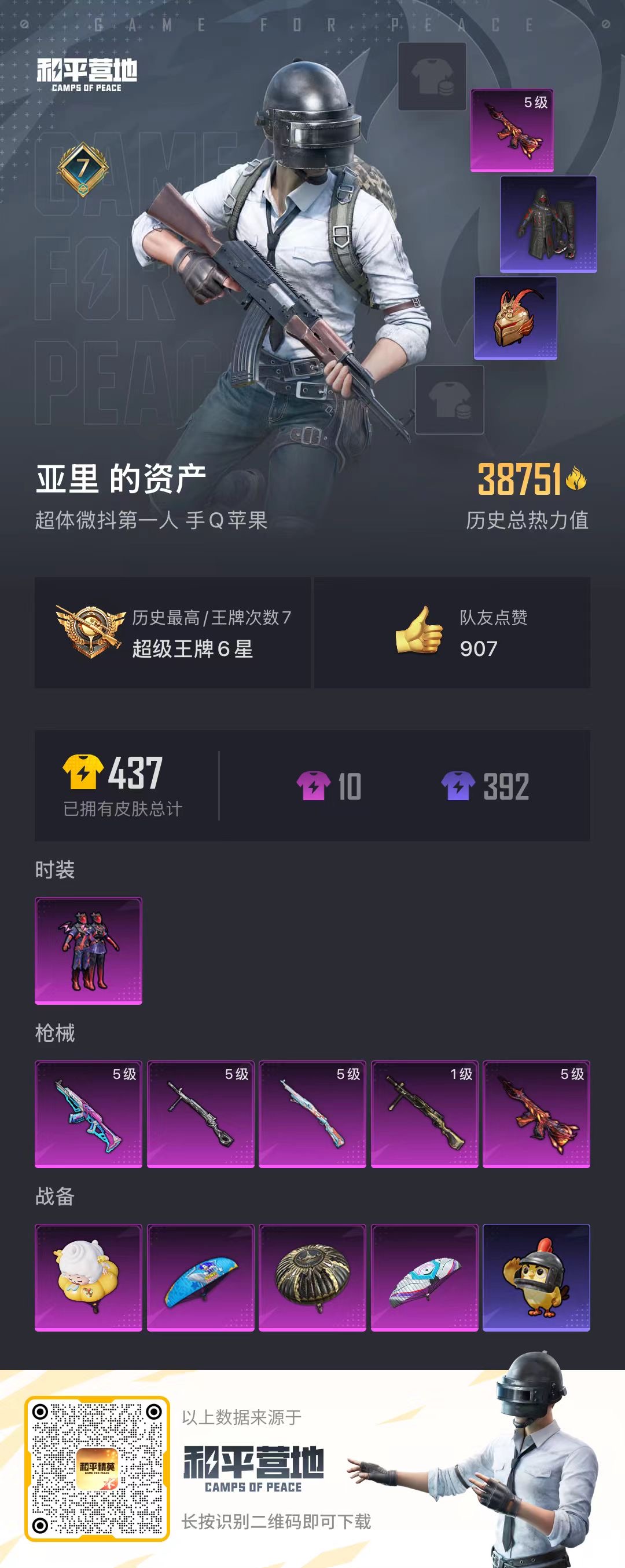 时装数: 369 枪械数: 114 战备数: 87 热门装扮: 迅捷狂鲨,鹰眼