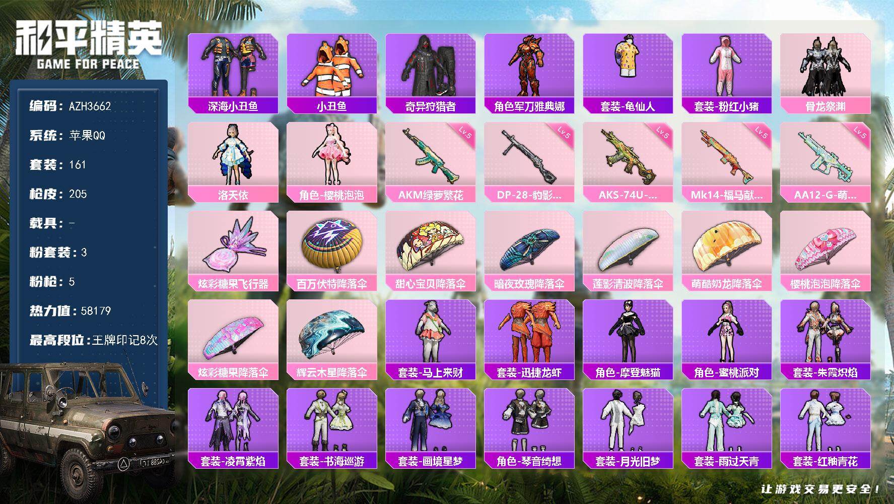 安卓 手Q-3粉装-5特效枪-1载具-1粉色飞行器-50085热力值-3王牌印记