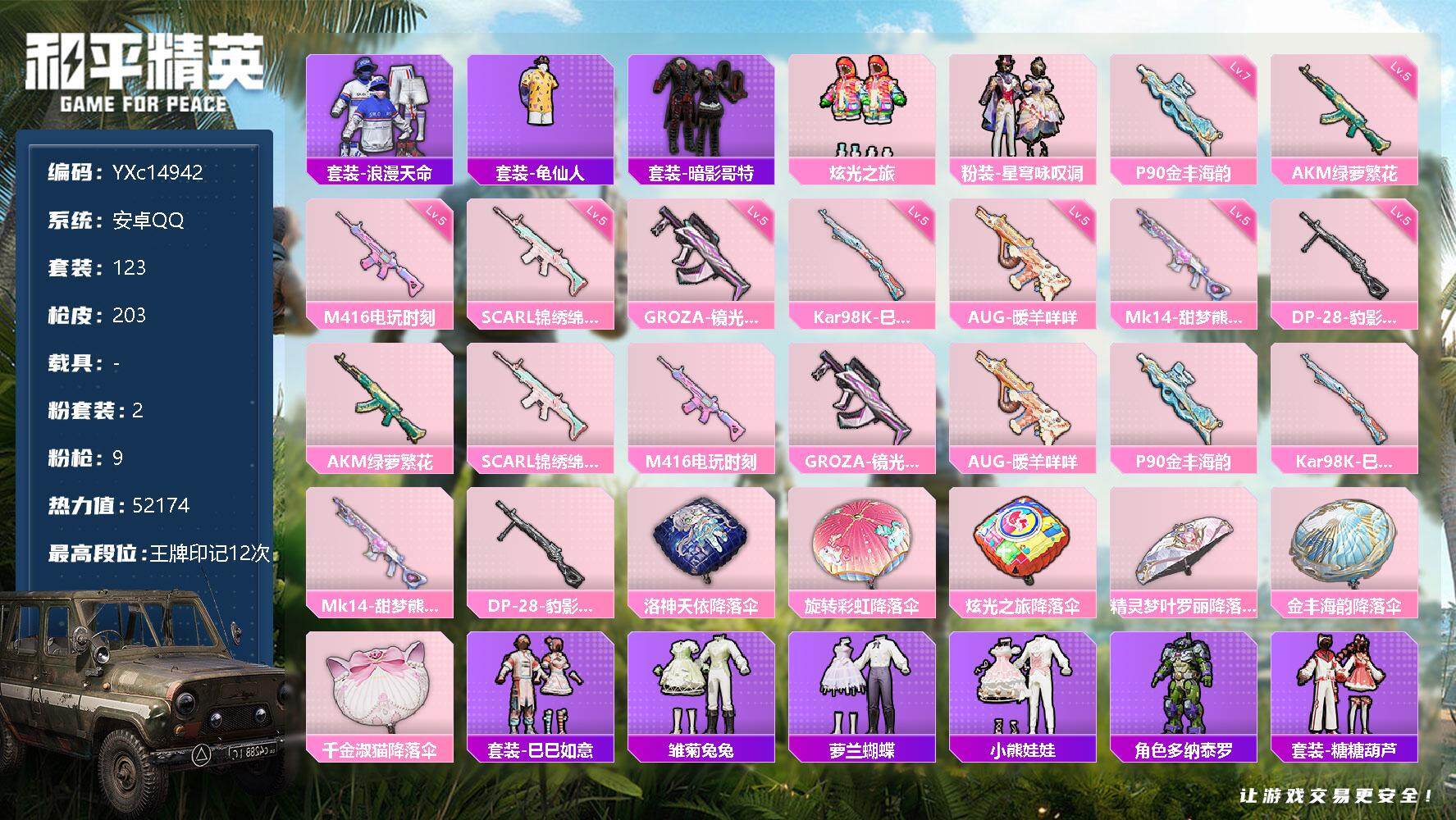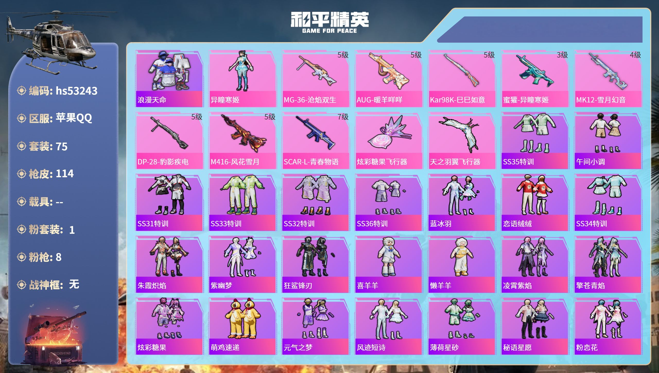 a3258/苹果QQ/-16王牌印记-1粉装-3特效枪-1载具-52110热力值-142套装-169