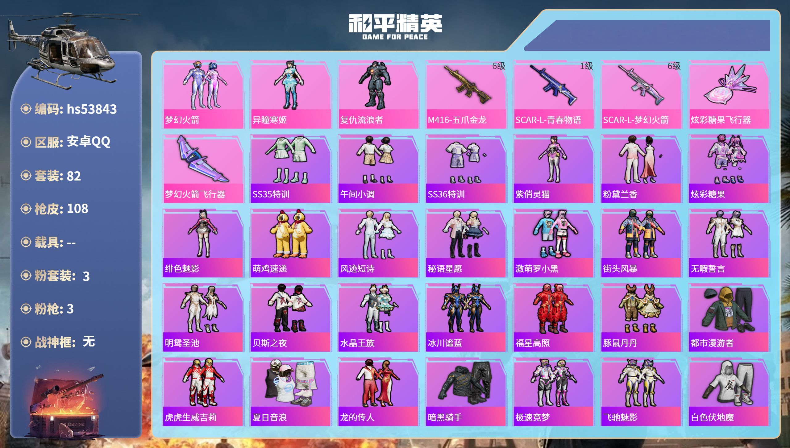hs53843 安卓手Q-7王牌印记-3粉装-3特效枪-35893热力值-82套装-108枪皮【3粉